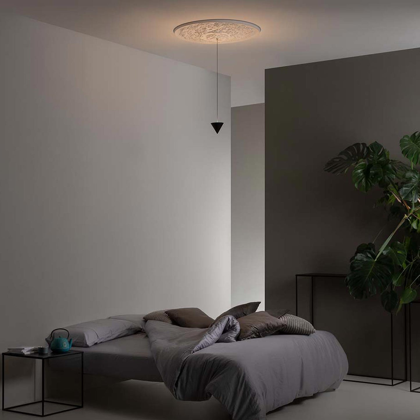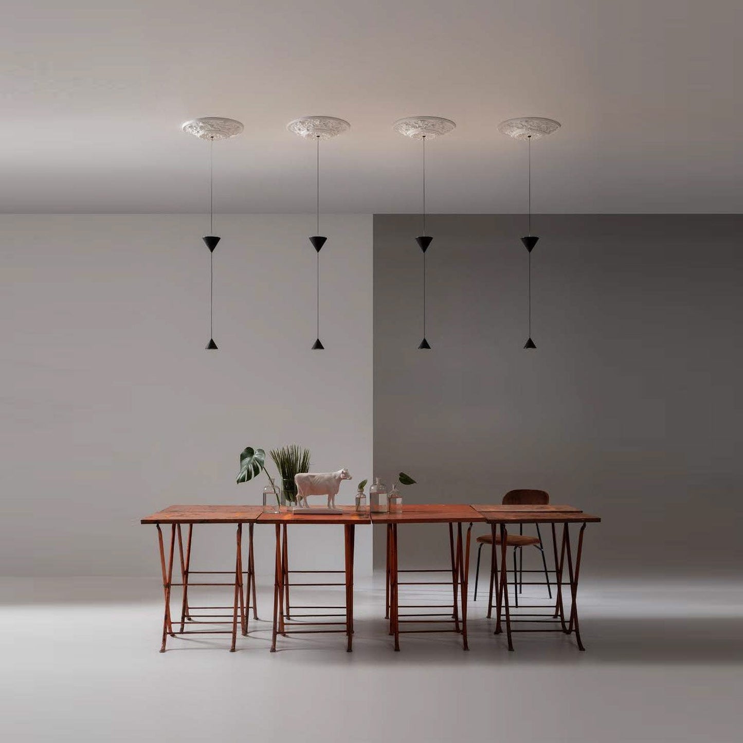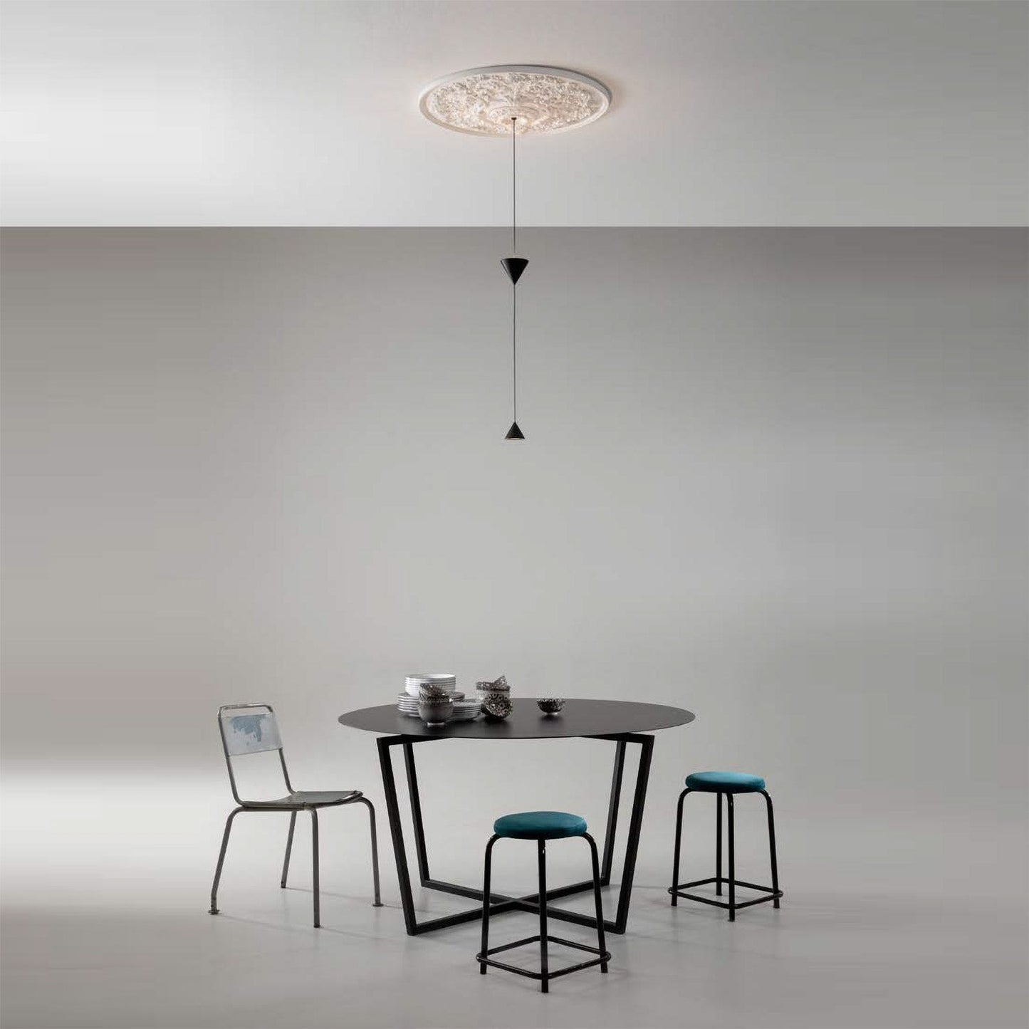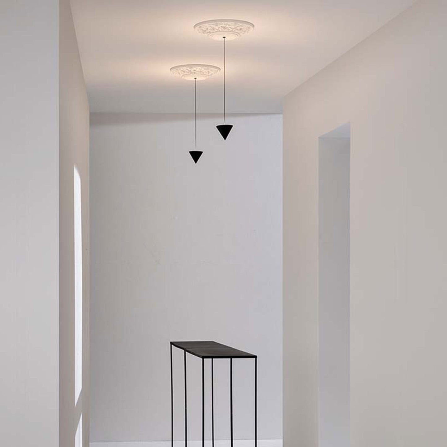 The sleek pendulum design of the Moonbloom LED Pendant Light from Karman creates a striking artistic touch to any space. Suspended from an ornately embellished, white plaster ceiling mount, the cone shape pendant dangles definitely, contrasted in style and tone.