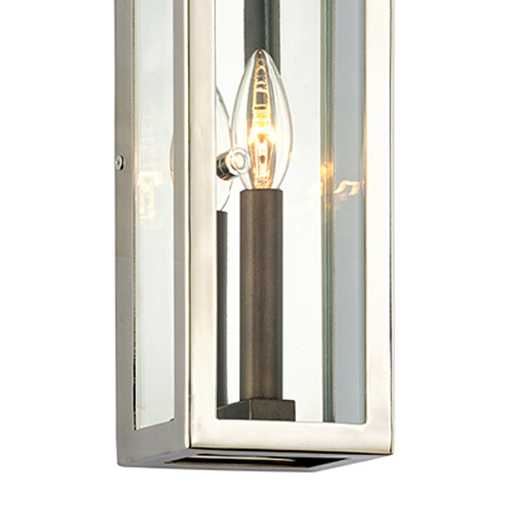 Modern glam accents an exterior space when the Morgan B6511 Outdoor Wall Light from Troy Lighting takes center stage with a boxy frame made of polished stainless and bronze finish metal with a clear glass shade.