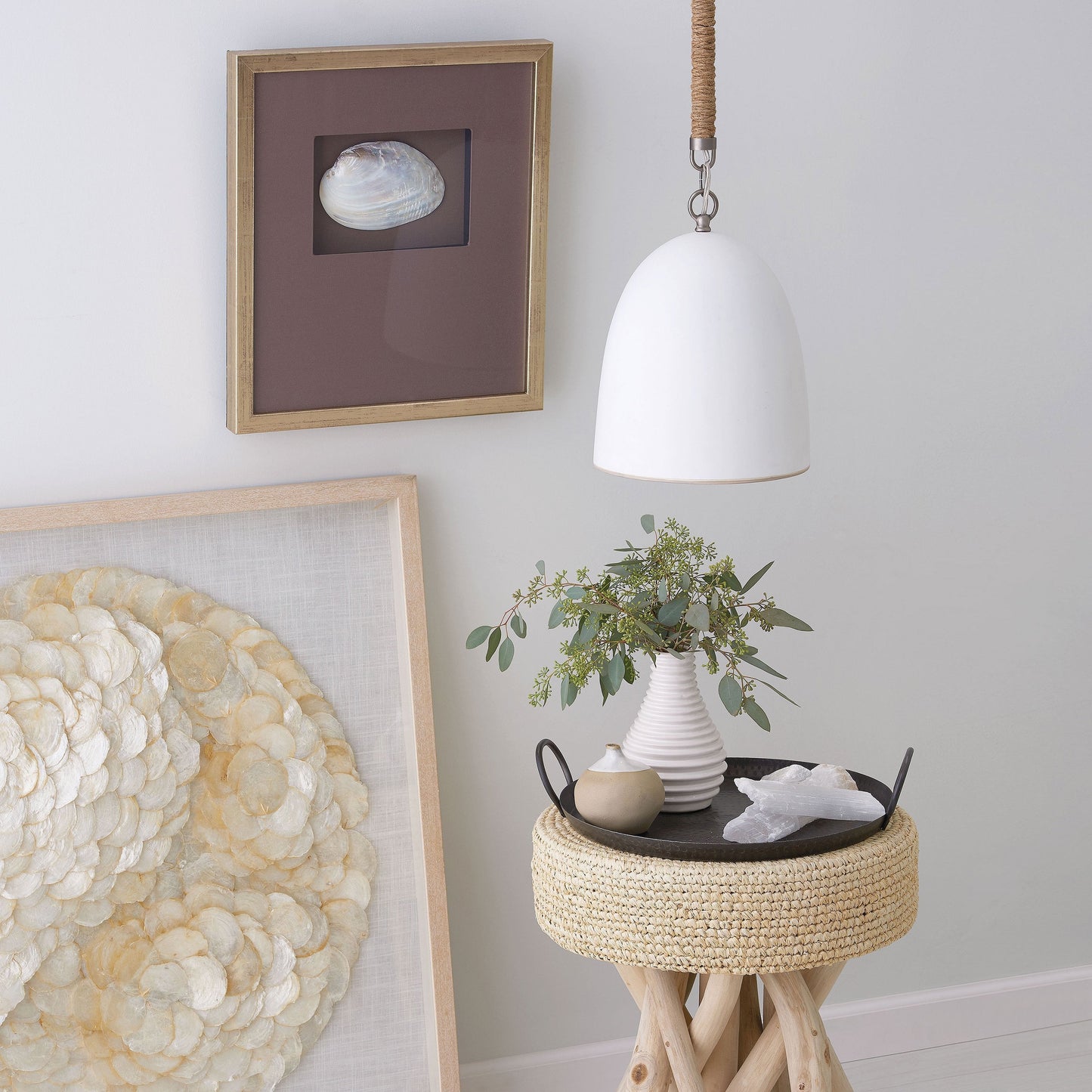 Fresh and welcoming, Nash Pendant Light merges sculptural and functional features with coastal inspiration. Hand-painted stripes and contrasting tipping complete the thrown ceramic shade. Combined with a thick jute rope, the details of Nash bring organic warmth and texture to any space.