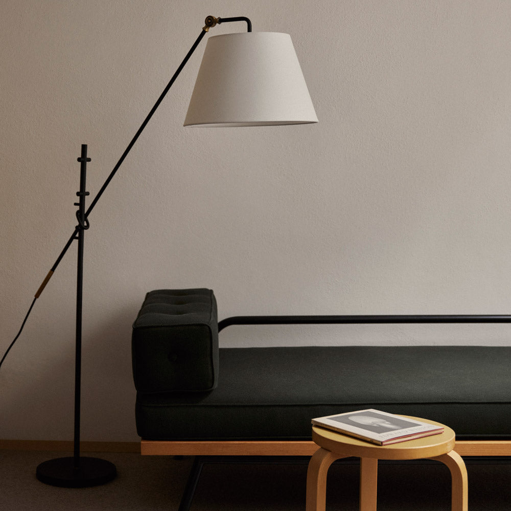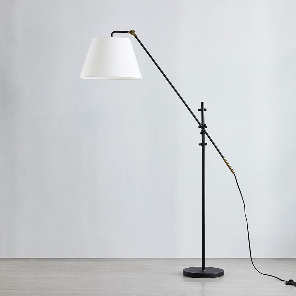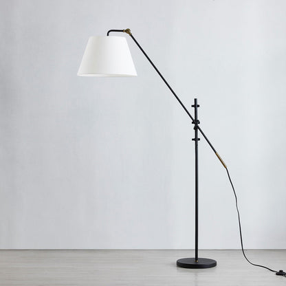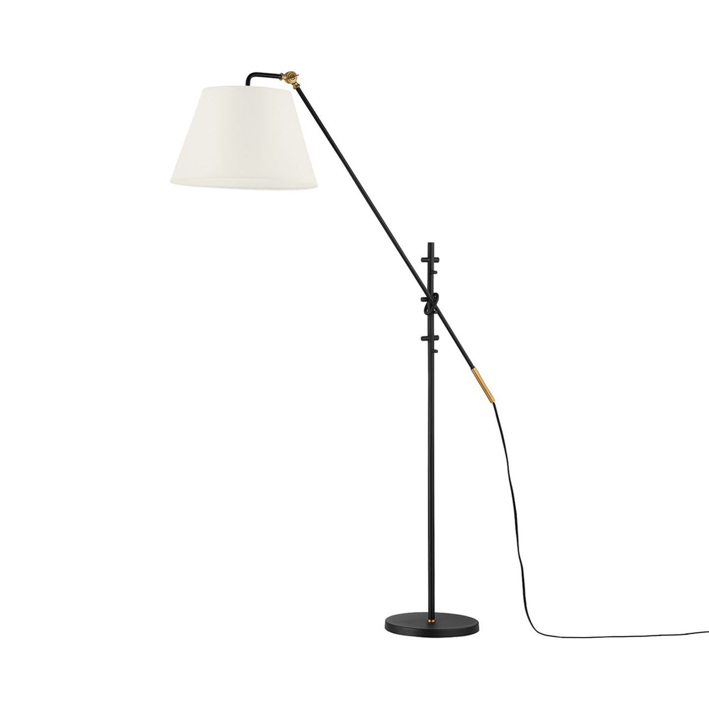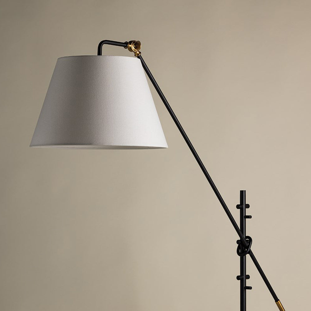 Textured metal begins a sleek journey into lighting décor as the Navin Floor Lamp from Troy Lighting maintains focus on asymmetry and industrial style. Patina brass finish mechanical accents offer adjustability as they change up the mood, and a beautifully traditional tapered white linen shade filters ambient illumination in a living room, bedroom, or home office space.