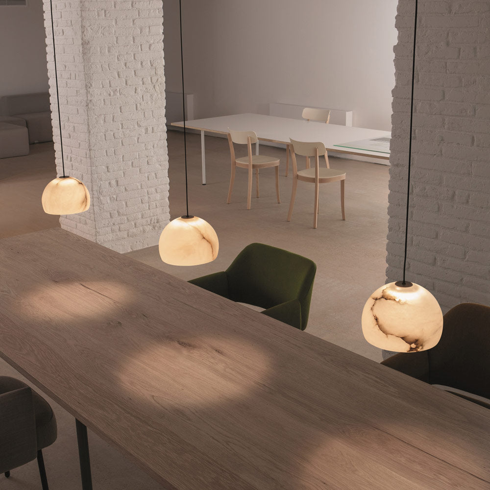 The natural appeal of alabaster stone instills an organic feel, embellished with optically pleasing silhouetting and emitting soft, energy efficient lighting. The secret is the Neil LED Pendant Light from Carpyen, a gallery inspired fixture with calming qualities as well as superb palette versatility. Chic with a level of transparency, its open globe shade and unique markings create simplicity mixed with glam.