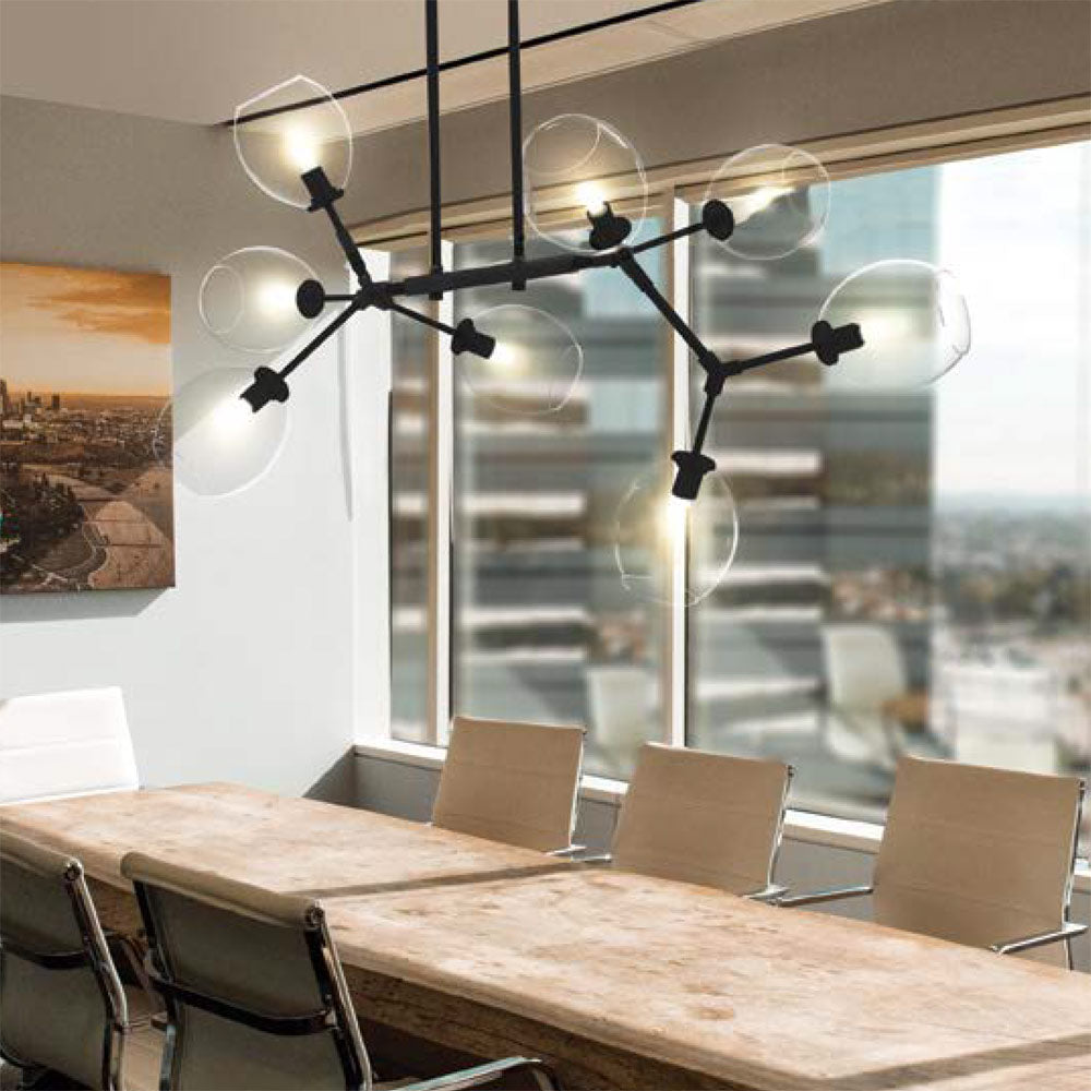 Touches of black and glass tulip shades augment the bold, dynamic Sputnik silhouette of the Nexpo Linear Pendant Light from George Kovacs in brushed nickel and coal finish.