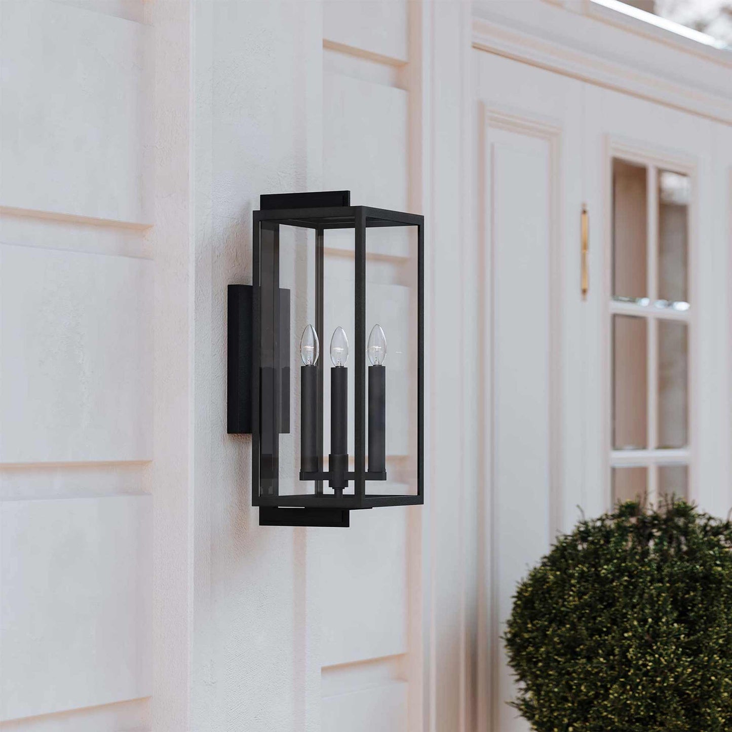 A striking box silhouette adds bold style and a sophisticated ambiance to an external structure when the Nico Outdoor Wall Light from Troy Lighting creates a dramatic source of accent lighting.