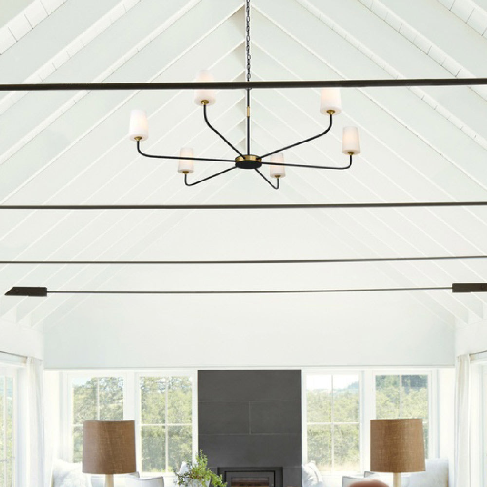 A low-profile look embellished with dramatic silhouetting shows up to create a captivating light source sending warm illumination over a dining ensemble or in a foyer. Modern and transitional settings welcome the Niles Chandelier from Crystorama, an easy aesthetic delivering generously curved arms capped with tapered white glass shades. Contrasting finishes of black forged deep black and modern gold mix up its palette to add intrigue and versatility.