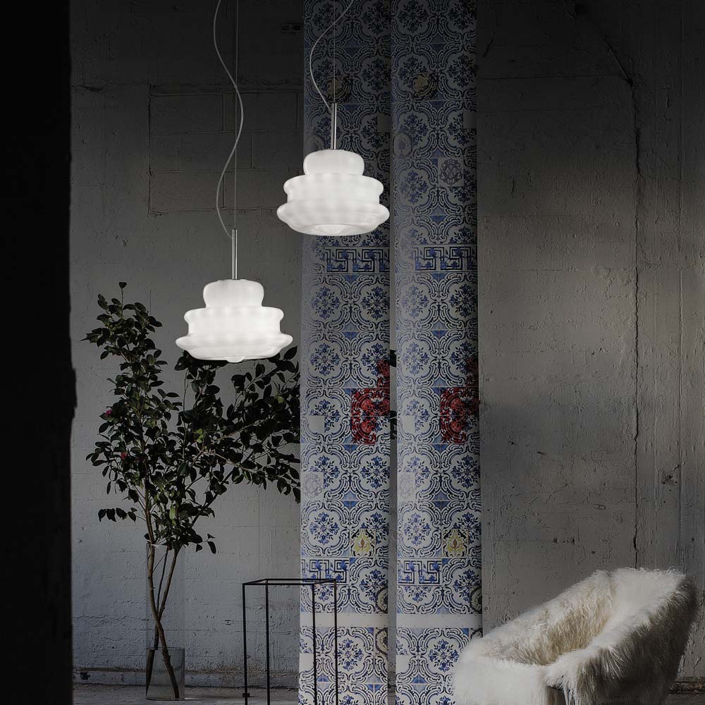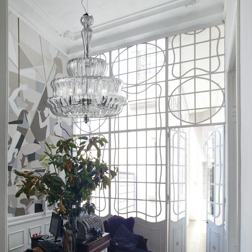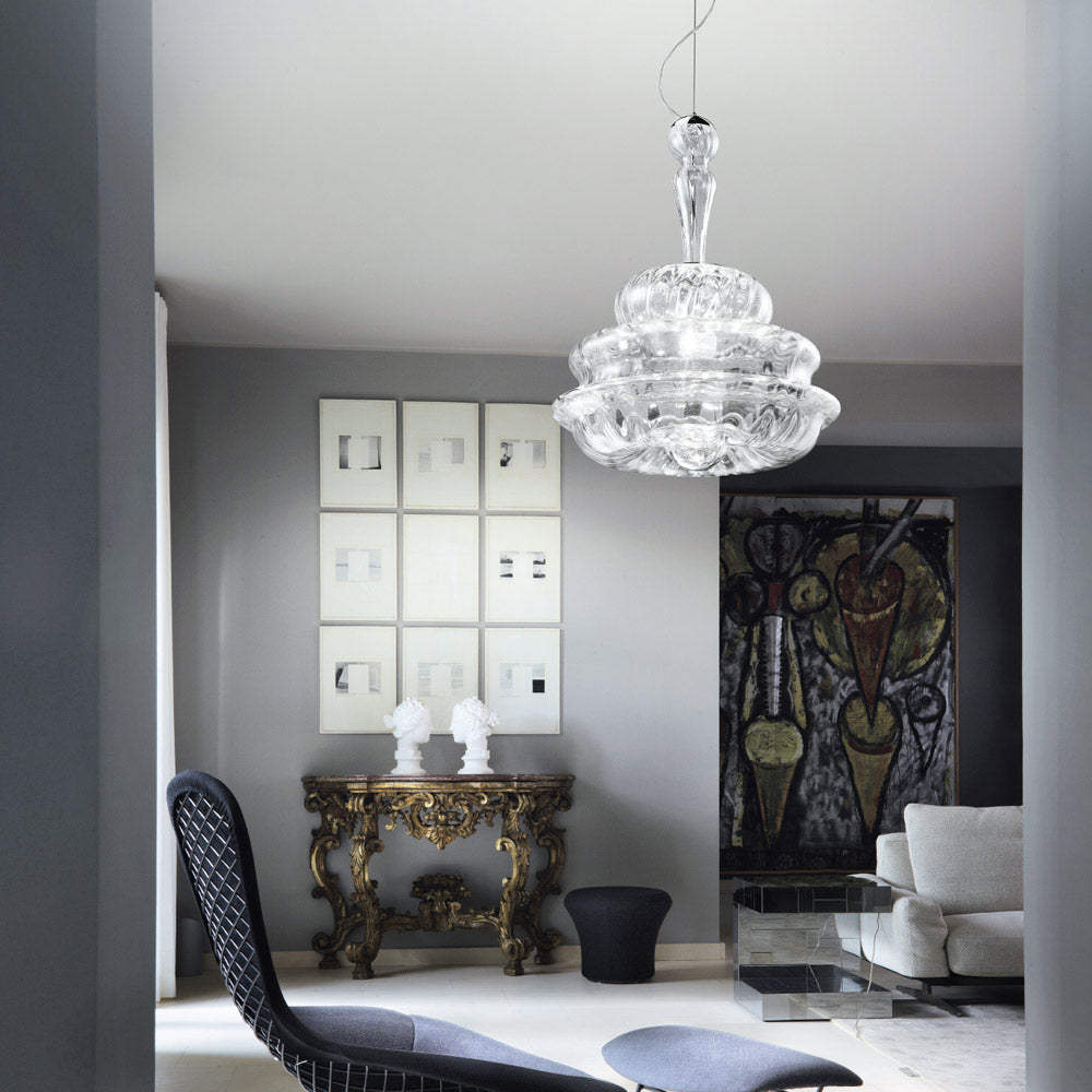 Art intersects with utility in the most romantic way, creating an exceptional example of glam lighting. The Novecento Pendant Light from Vistosi delivers on intrigue and intricate design elements with a layered silhouette and a rich, delicate glass shade.