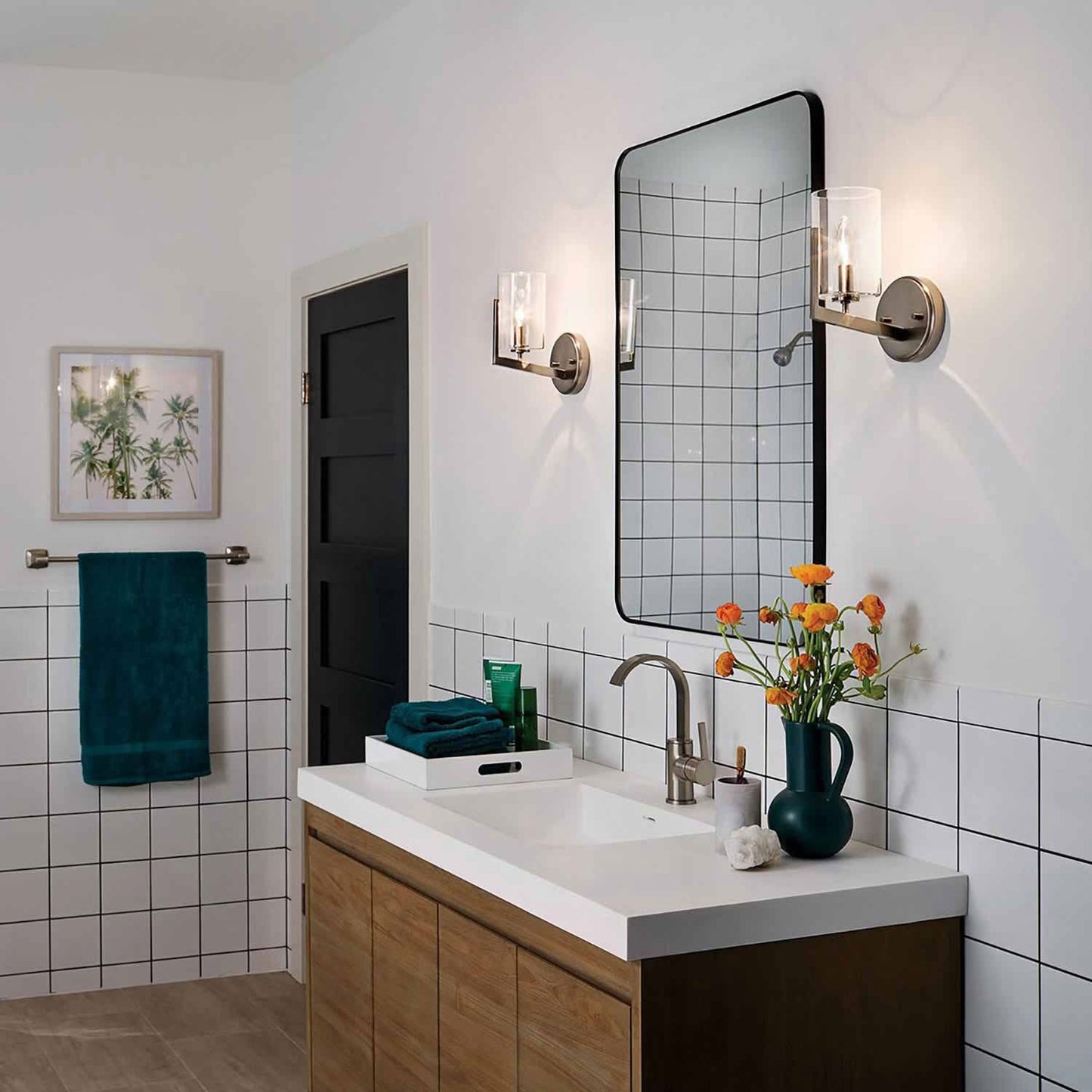 The Nye™ 9.75" 1 light wall sconce features a mid century modern design in Brushed Natural Brass, Classic Pewter and clear glass. A perfect addition in several aesthetic environments including contemporary and transitional.