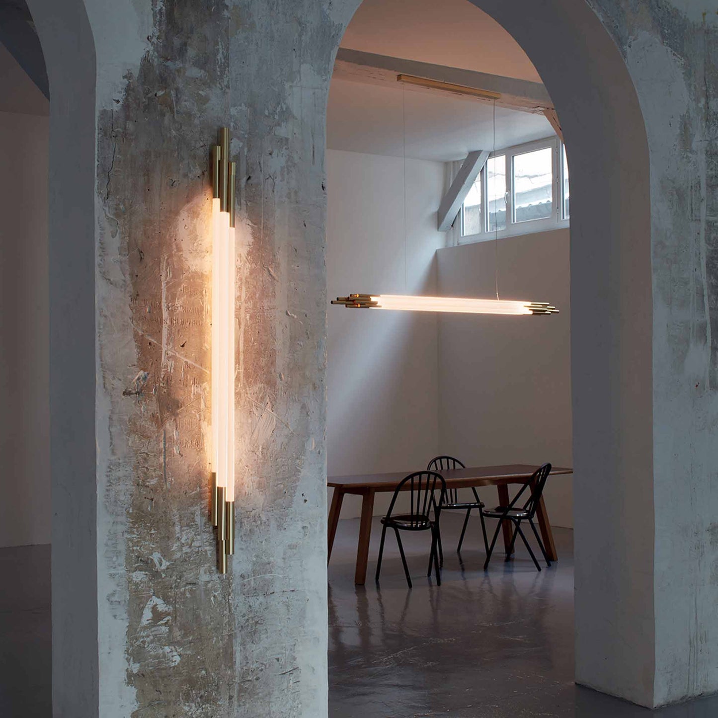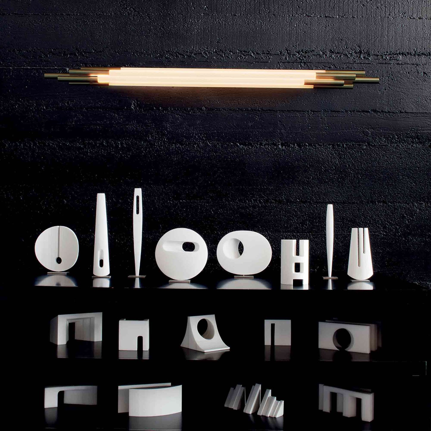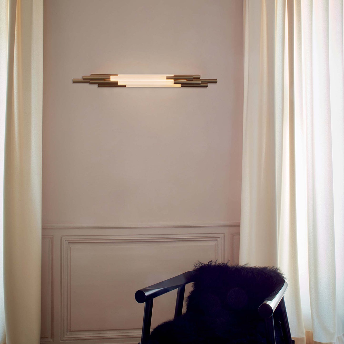 Wall lamp in anodised aluminum (gold finish) and opaline glass. Inspired by science fiction and astronomy, Sebastian Summa based his lamp on a shooting star. Elegant and surprisingly classic, Org goes from raw spaces to sophisticated universes.