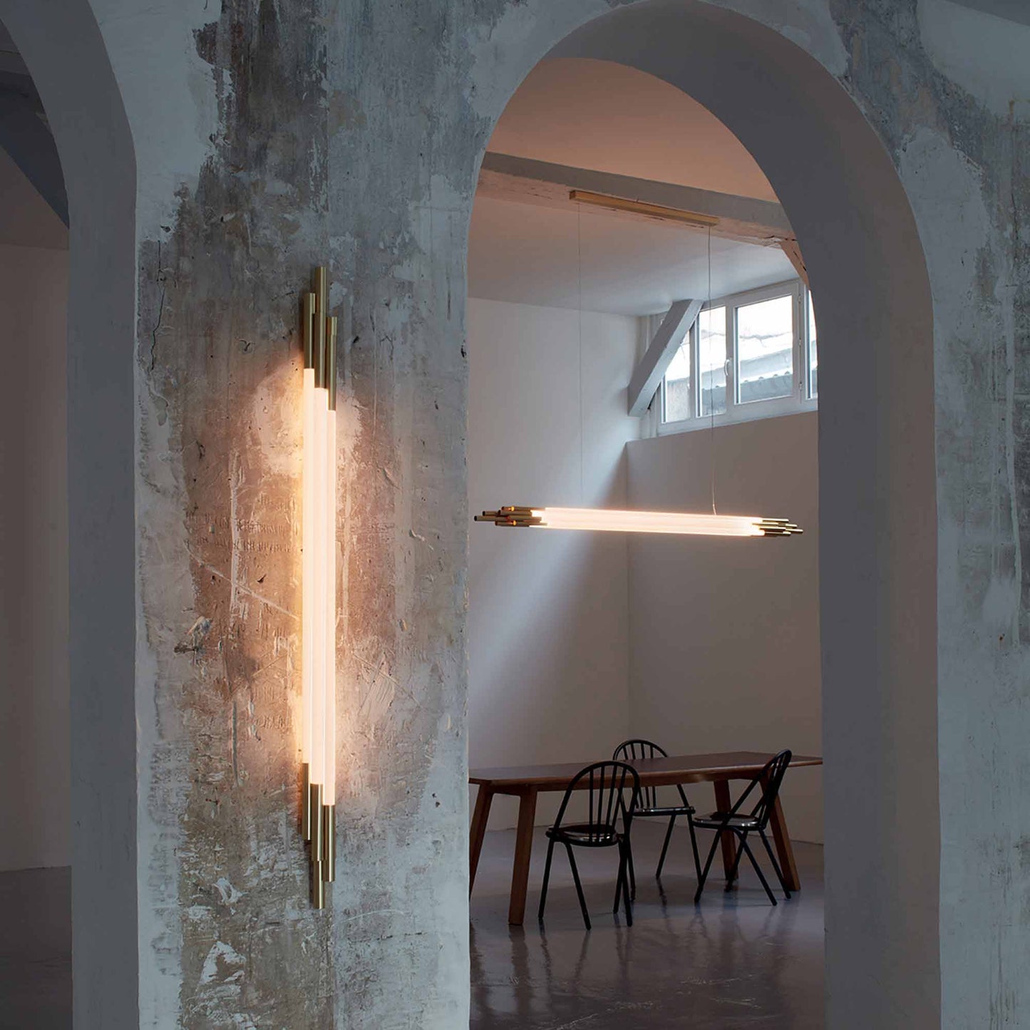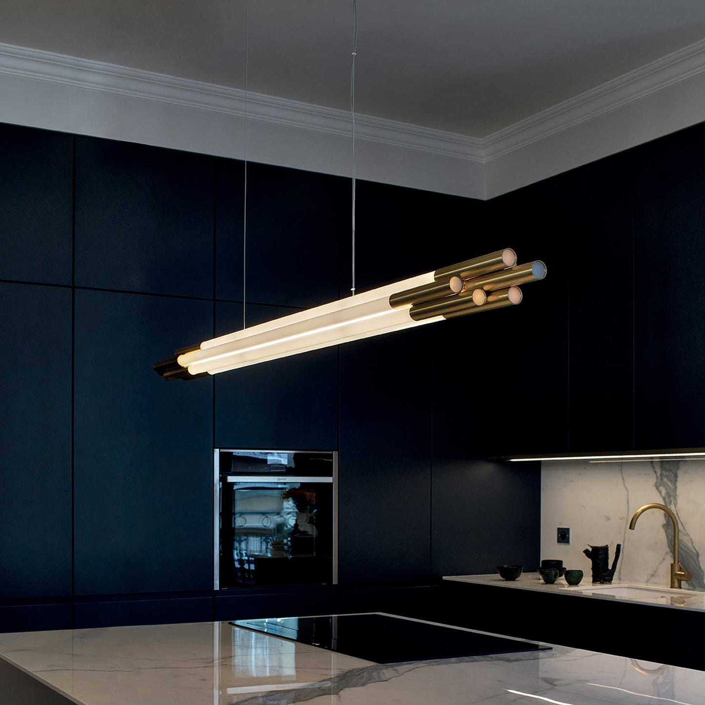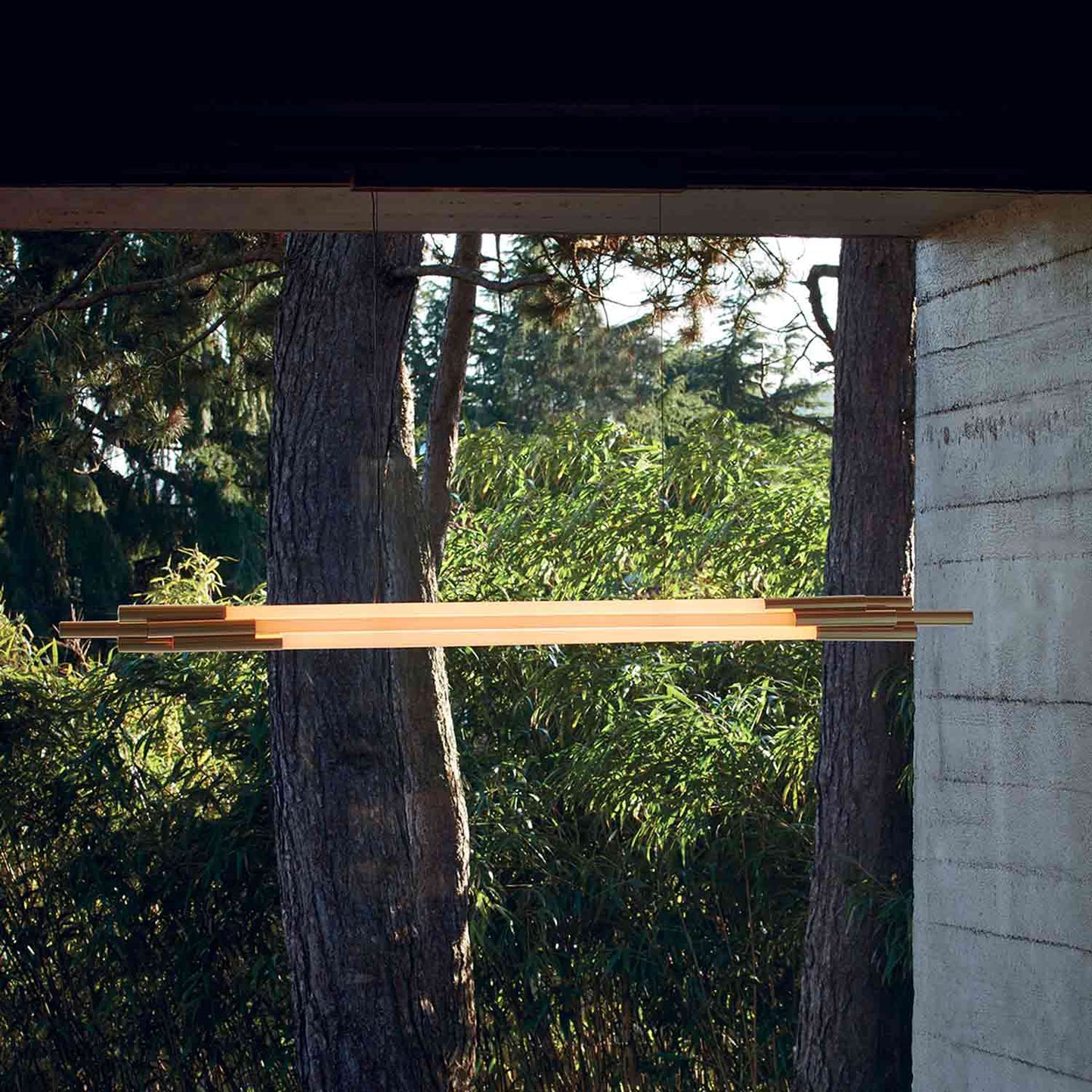 Horizontal pendant lamp in anodised aluminum (gold finish) and opaline glass. The designer Sébastien Summa was inspired by science fiction and astronomy to create a lamp like a shooting star. Available in 3 sizes, and also as a vertical pendant.