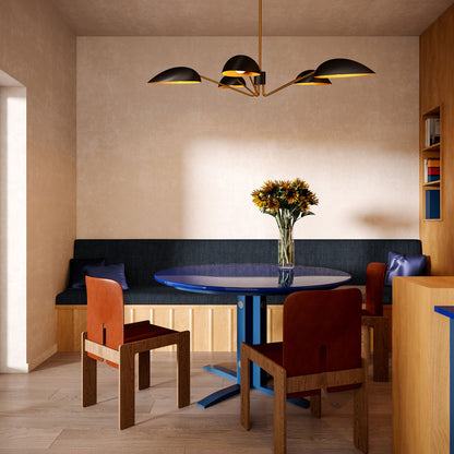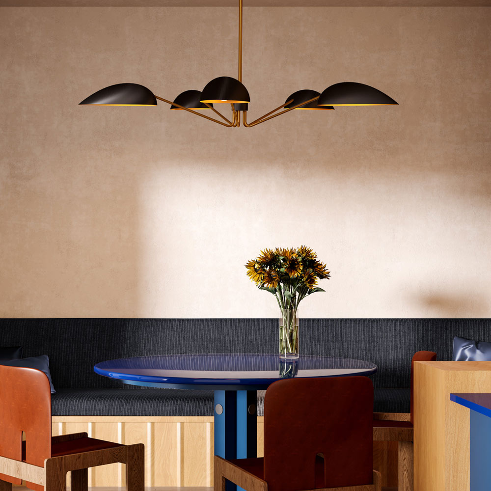 The Oscar Chandelier from Alora Mood creates a nature-influenced angelic silhouette and a classic motif shaped by old Hollywood. Dual hat shades constructed of metal balance on each side, adding an Art Deco look of vintage style as well as a wide lighting reach embellished by a center teardrop shade.