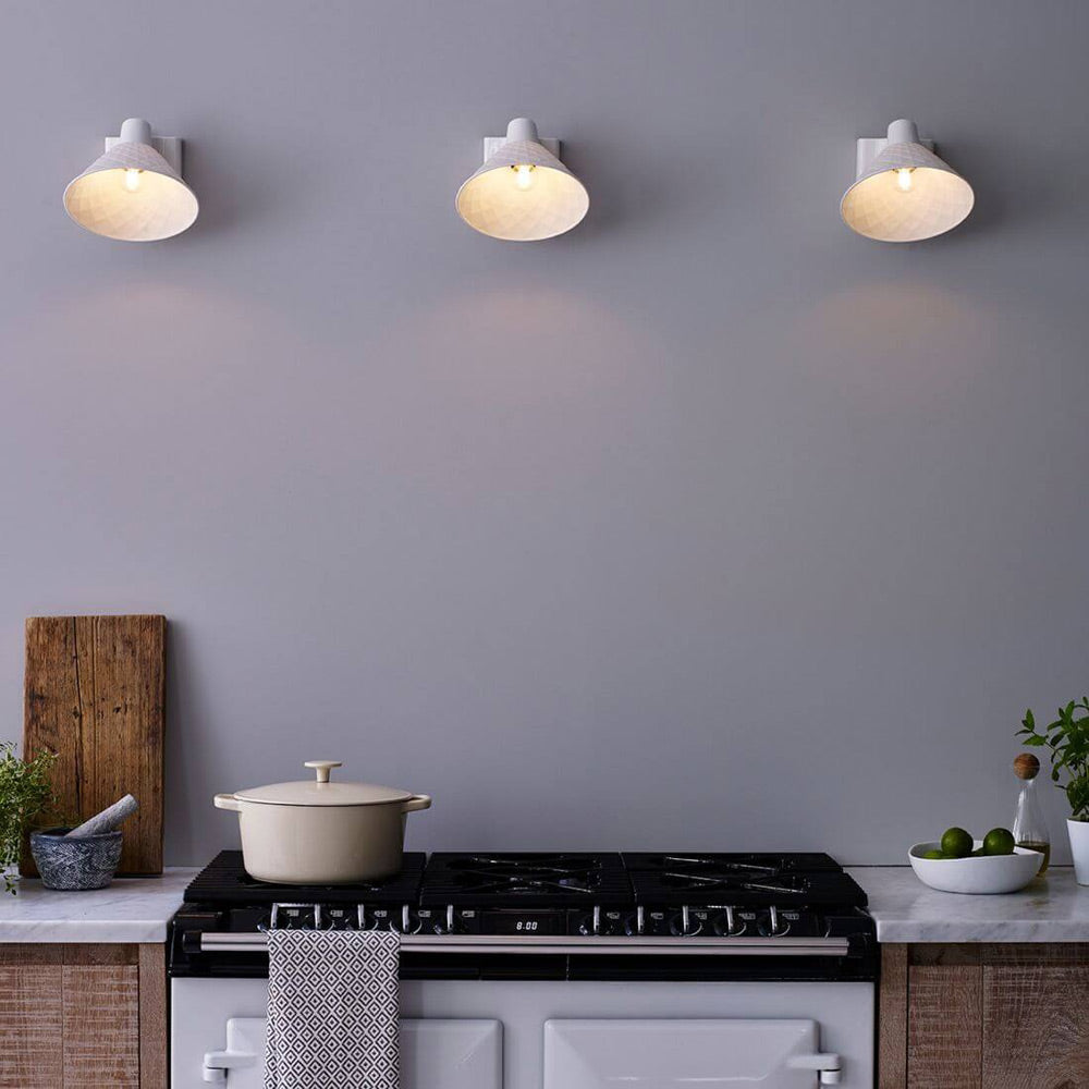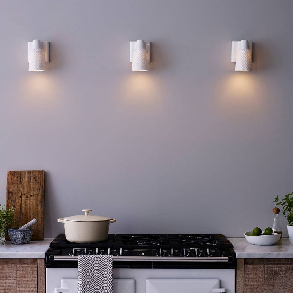 Create soft ambient lighting to illuminate living areas with the Oxford Wall Light from Original BTC. A mix of textural grid-patterned bone china and smooth bone china fashioning a shade and mount, it adds an artisan element that works in both casual and more sophisticated design schemes.