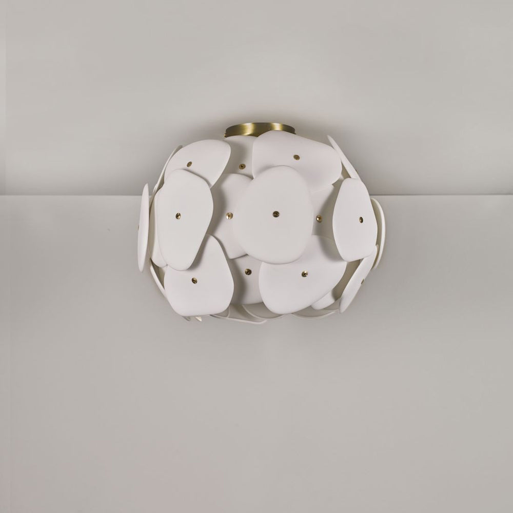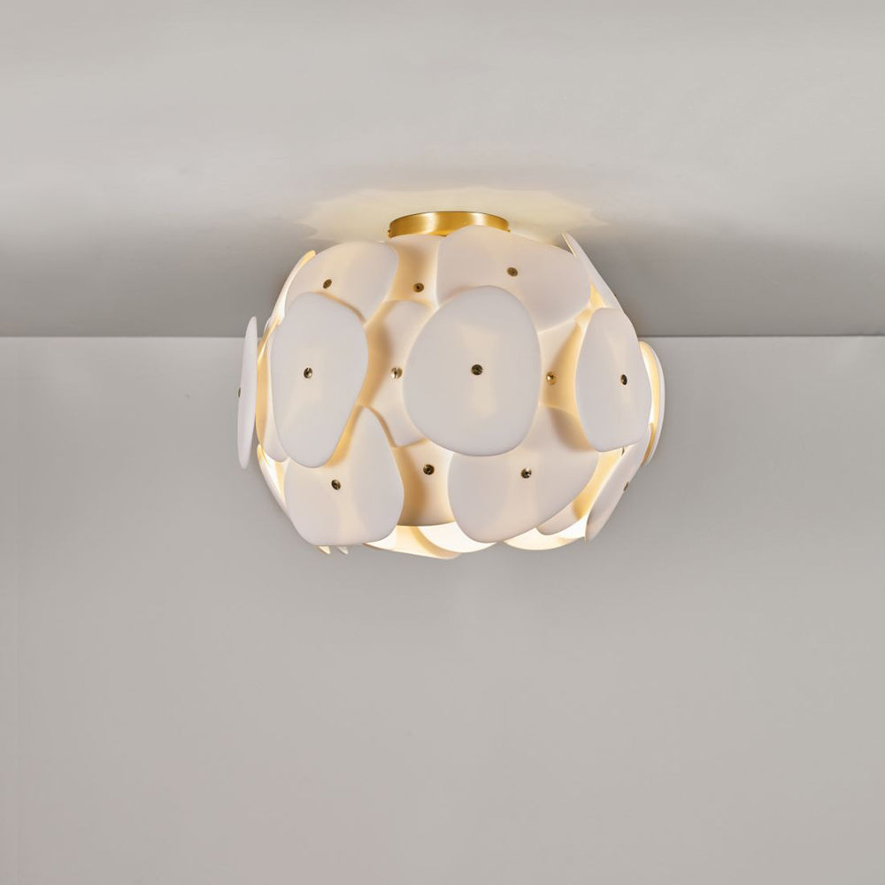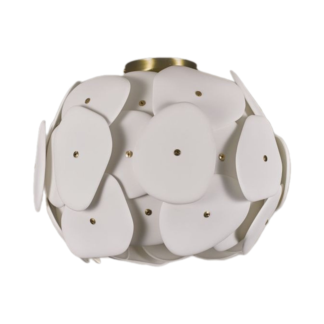 Natural artisan character fashions an incomparable addition to a casual space devoted to accelerated style. The Pebble Flush Mount Ceiling Light from Original BTC centers on soft, organic essence with misshapen discs of bone china forming a rounded shade, allowing illumination to flow through its spaces of separation. Subtle metal accents offer finishing touches to a light fixture reviving the romance of textural and sculptural beauty.