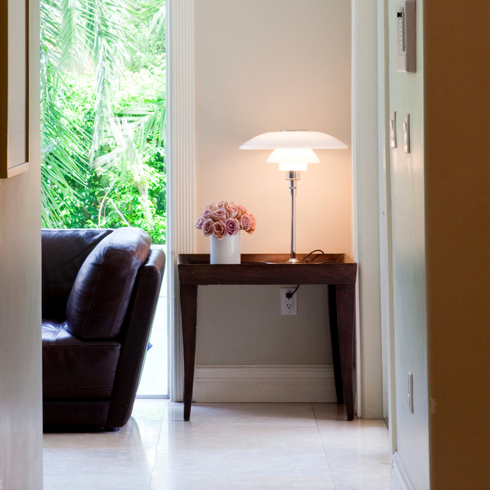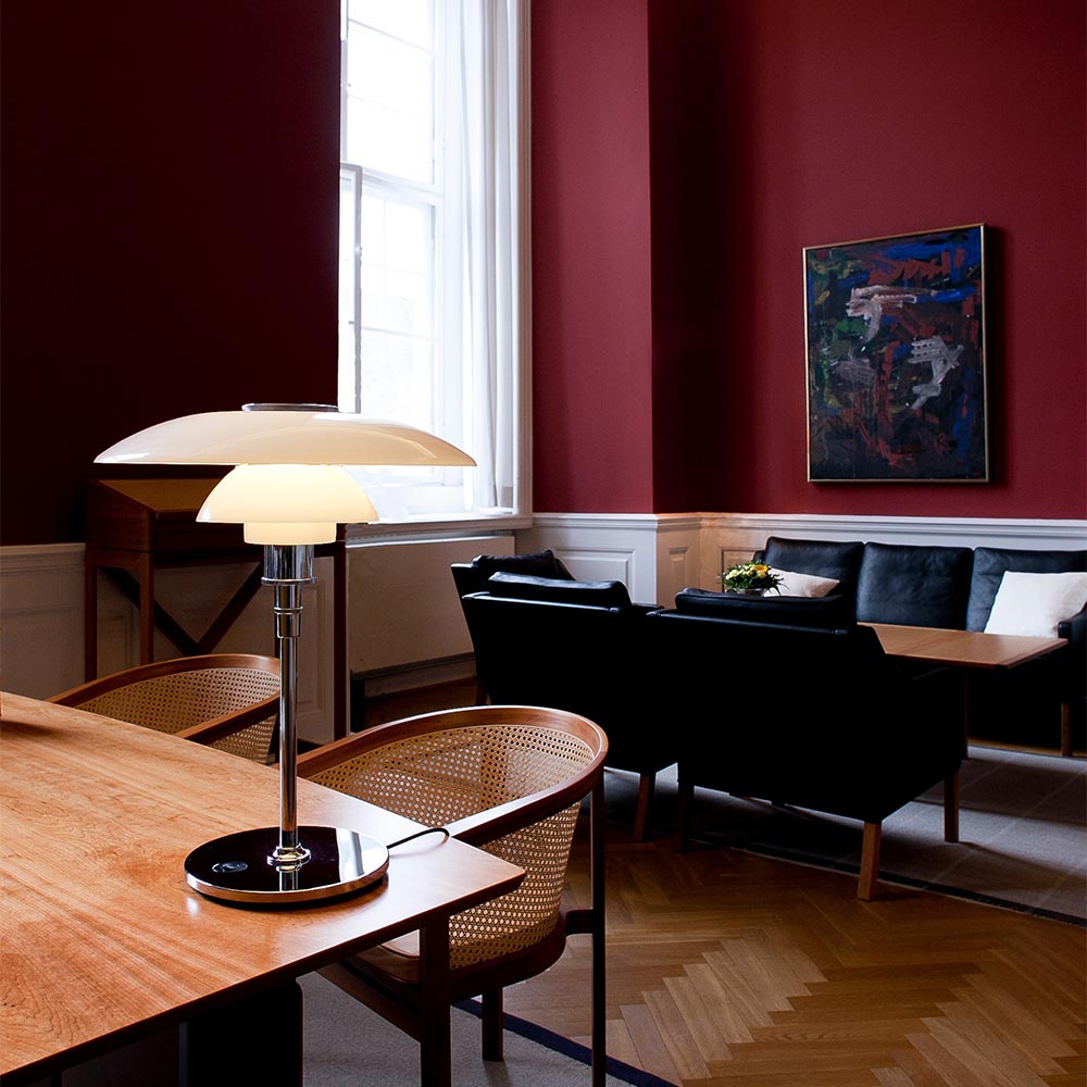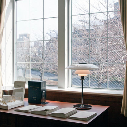 Lustrous chrome plating perfectly balances domed layers of mouthblown white opal glass to bring stellar elegance and sophistication to the PH 4½-3½ Table Lamp from Louis Poulsen. Casting a warm glow of downward illumination, the lamp is a perfect choice for a stylish desk in your home office or side table in a welcoming sitting area.