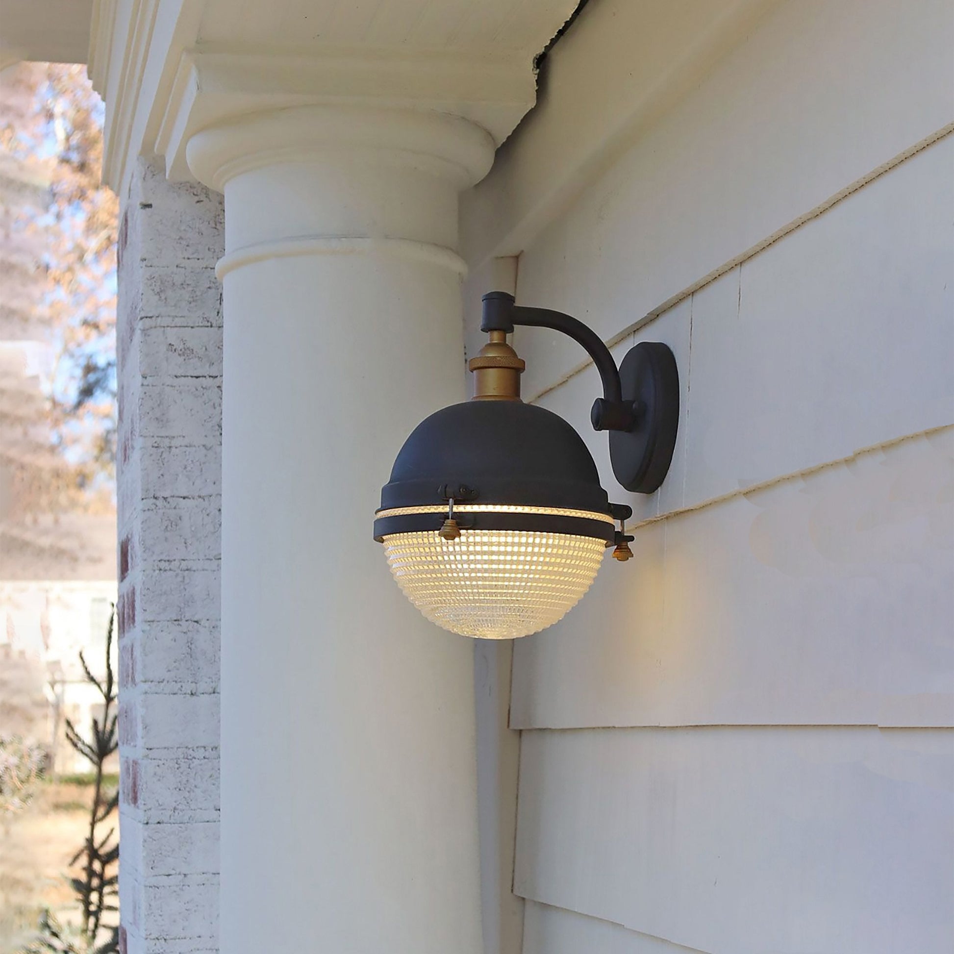 This nautical design features a solid dome of aluminum finished in oil rubbed bronze with solid brass hardware finished in antique brass. The clear prismatic glass diffuser completes the authentic look of this outdoor collection.