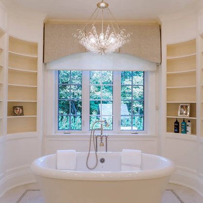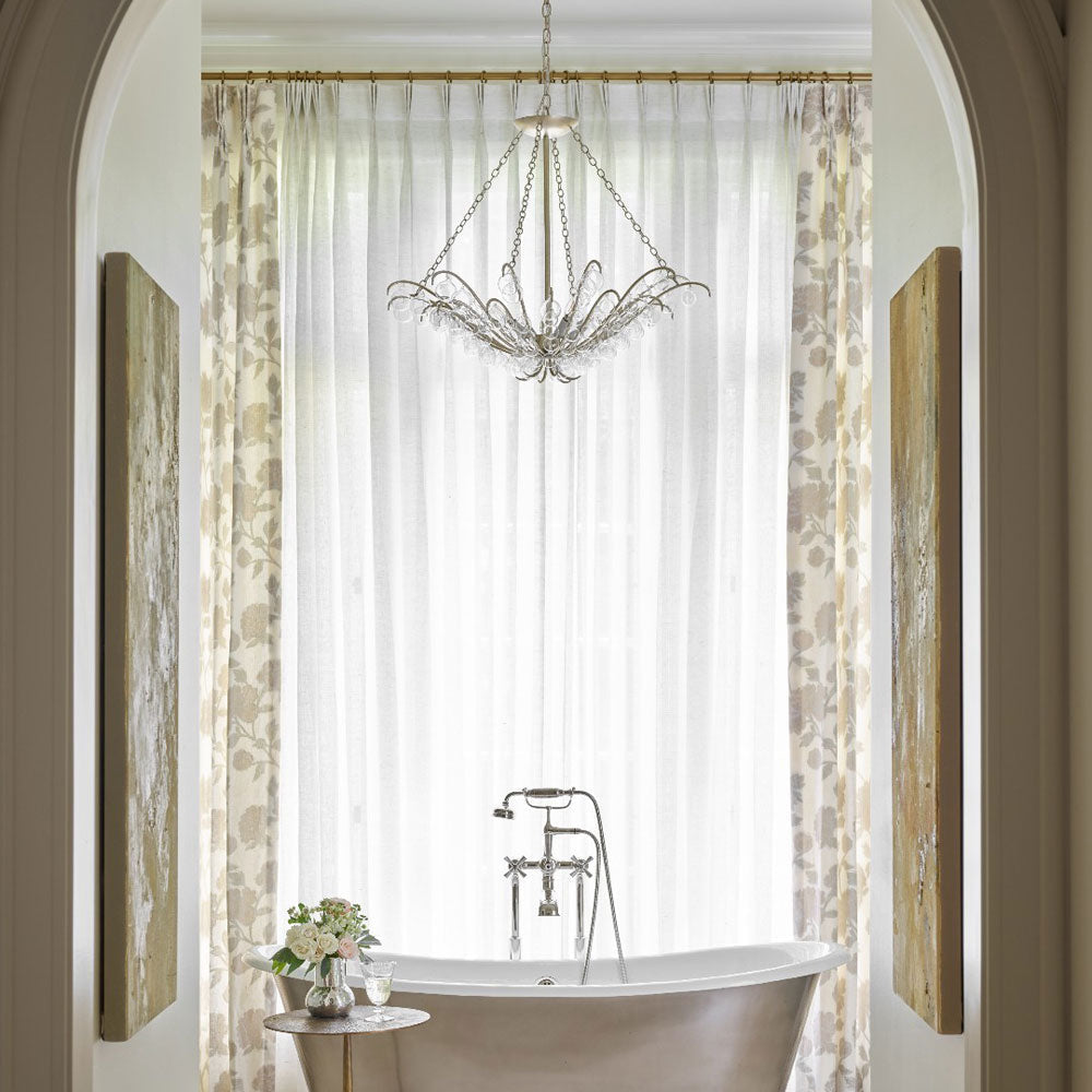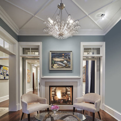 A chic motif repurposing lace and pearls creates decadence with romantic silhouetting in a light fixture adding a central focus to a glam-inspired setting. Delicate blown glass bubbles align along arched arms as the Quantum Chandelier from Currey and Company adds stunning style with carefully arranged metal framing and cable suspension creating symmetry and style perfect for highlighting a foyer, dining ensemble, or bedroom. Versatility follows lush wrought iron with a modern silver leaf finish, a graceful match for glass.