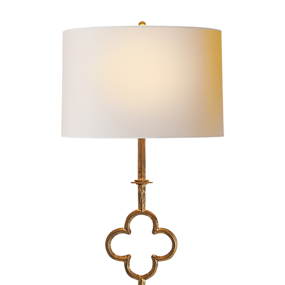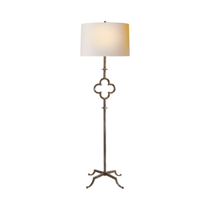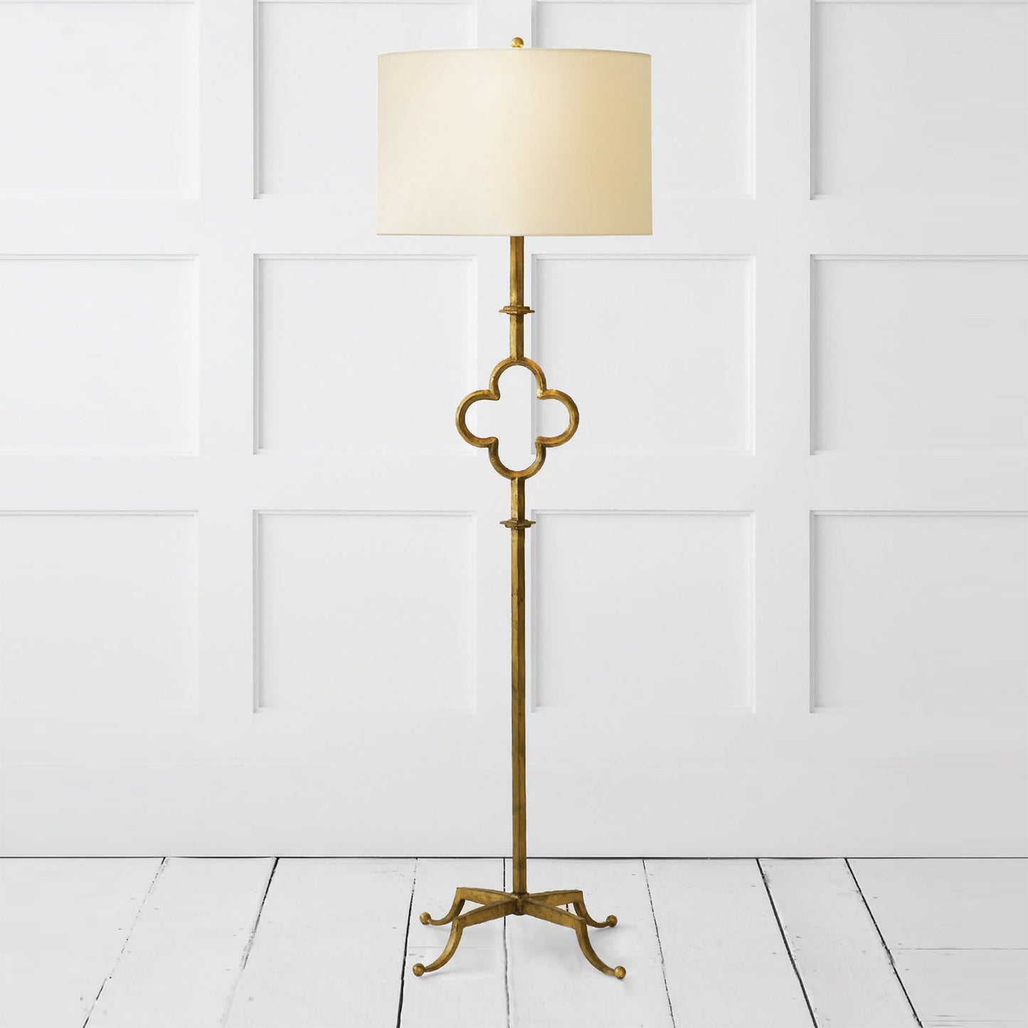 Romantic style elements embellish this floor lamp, a superb choice for softening the aesthetics of any living space. The Quatrefoil Floor Lamp from Visual Comfort Signature turns on a slender metal frame interrupted by a delightful quatrefoil-shaped cutout and set atop a shapely four-point base. Add to the themed look of a bedroom or living area with this tasteful floor lamp.