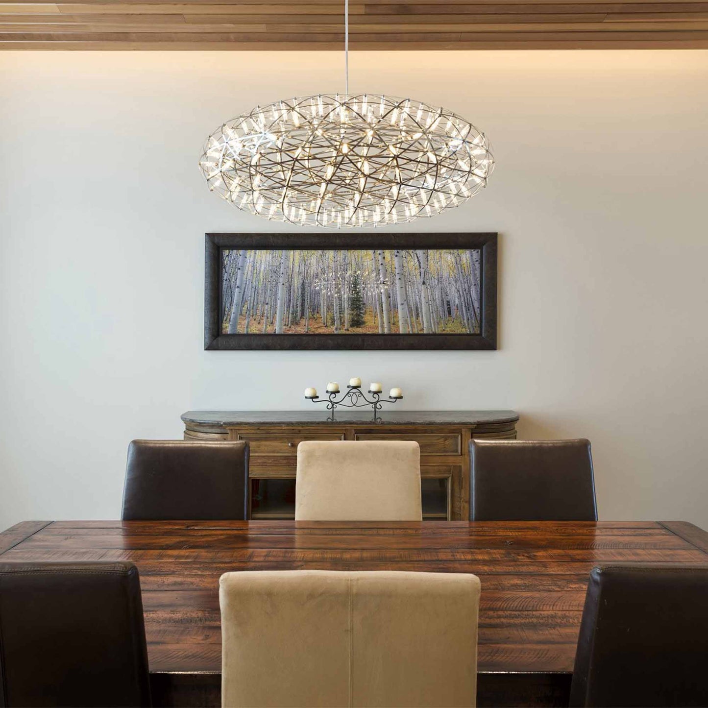 Dining areas with city scape backgrounds will be instantly complemented with the Raimond II Zafu LED Pendant Light from Moooi. Tiny energy efficient bulbs create an incredible illuminating effect that adds allure to your atmosphere.
