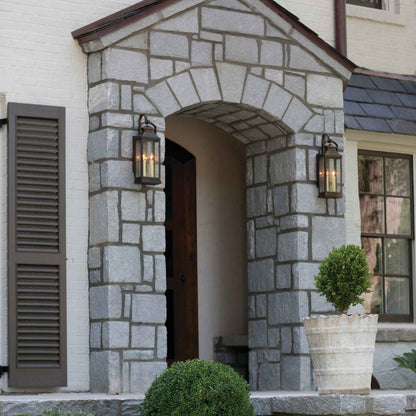 Distinguished traditional features bring a classic look of elegance to the Revere Outdoor Wall Light from Hinkley, adding a special touch to an exterior structure. With romantic clear seedy glass panels and glass faux candle sleeves, this fixture features village-inspired candelabra style bulb sockets to highlight character.