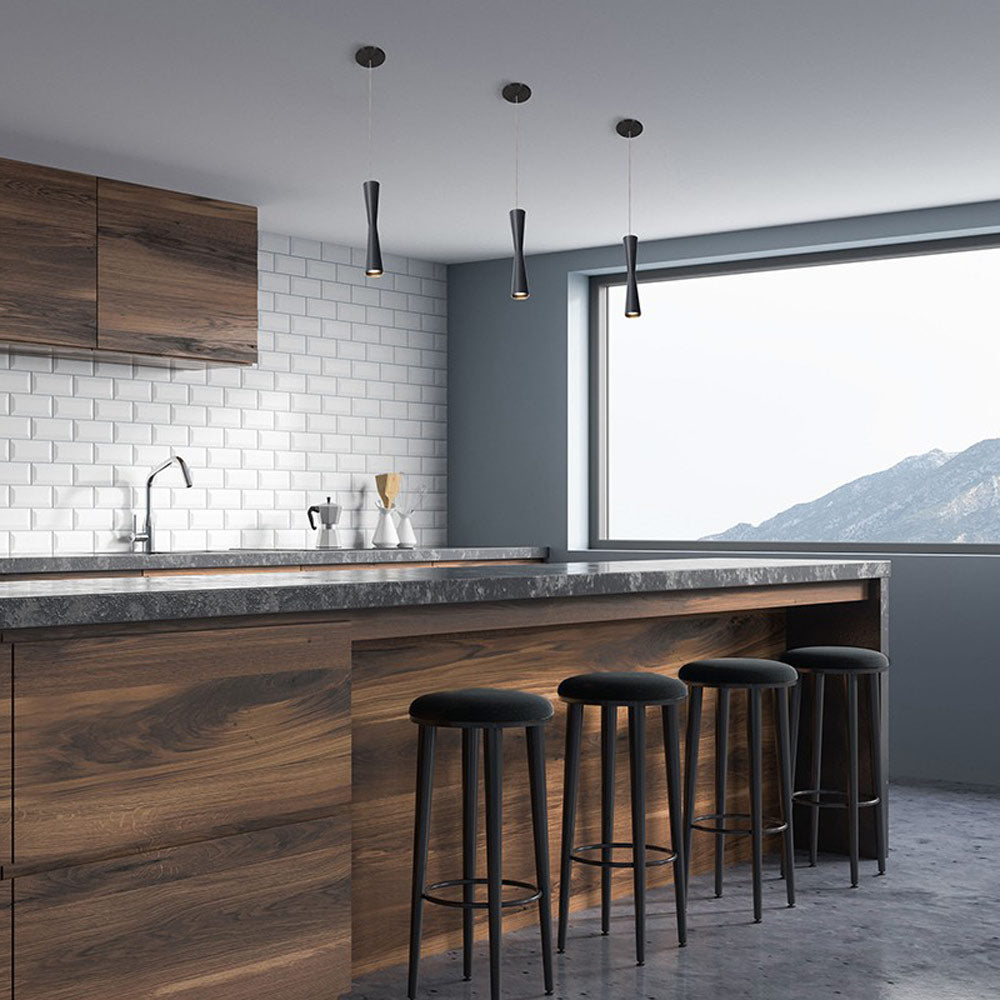 Concave silhouetting doubles the visual impact of the Robson LED Pendant Light from Kuzco Lighting, a dramatic yet minimalist fixture offering energy-efficient, soft lighting. Sleek and vertically oriented, this aluminum constructed light is capped with dual translucent acrylic diffusers infusing a glowing illumination upwards and downwards.