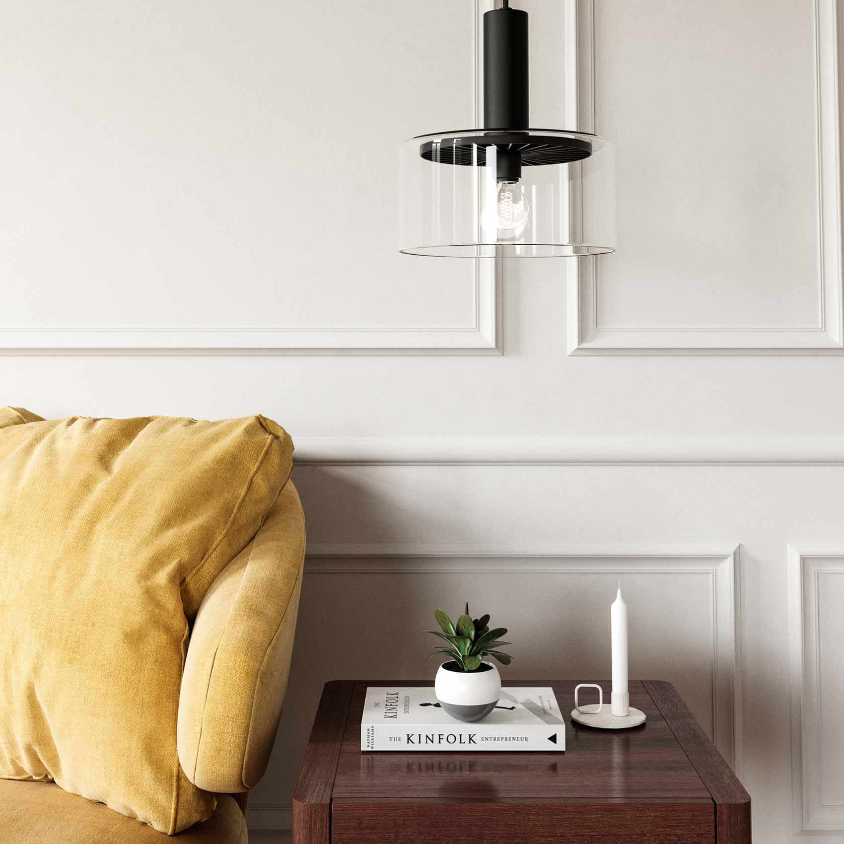 Chic artistry mimics Art Deco personality as the Royale Pendant Light from Alora Mood lends a delightful silhouette and ambient lighting to a custom setting. A decorative sunburst design inside its classic glass shade is visible from below, stamping a signature statement sure to impress.