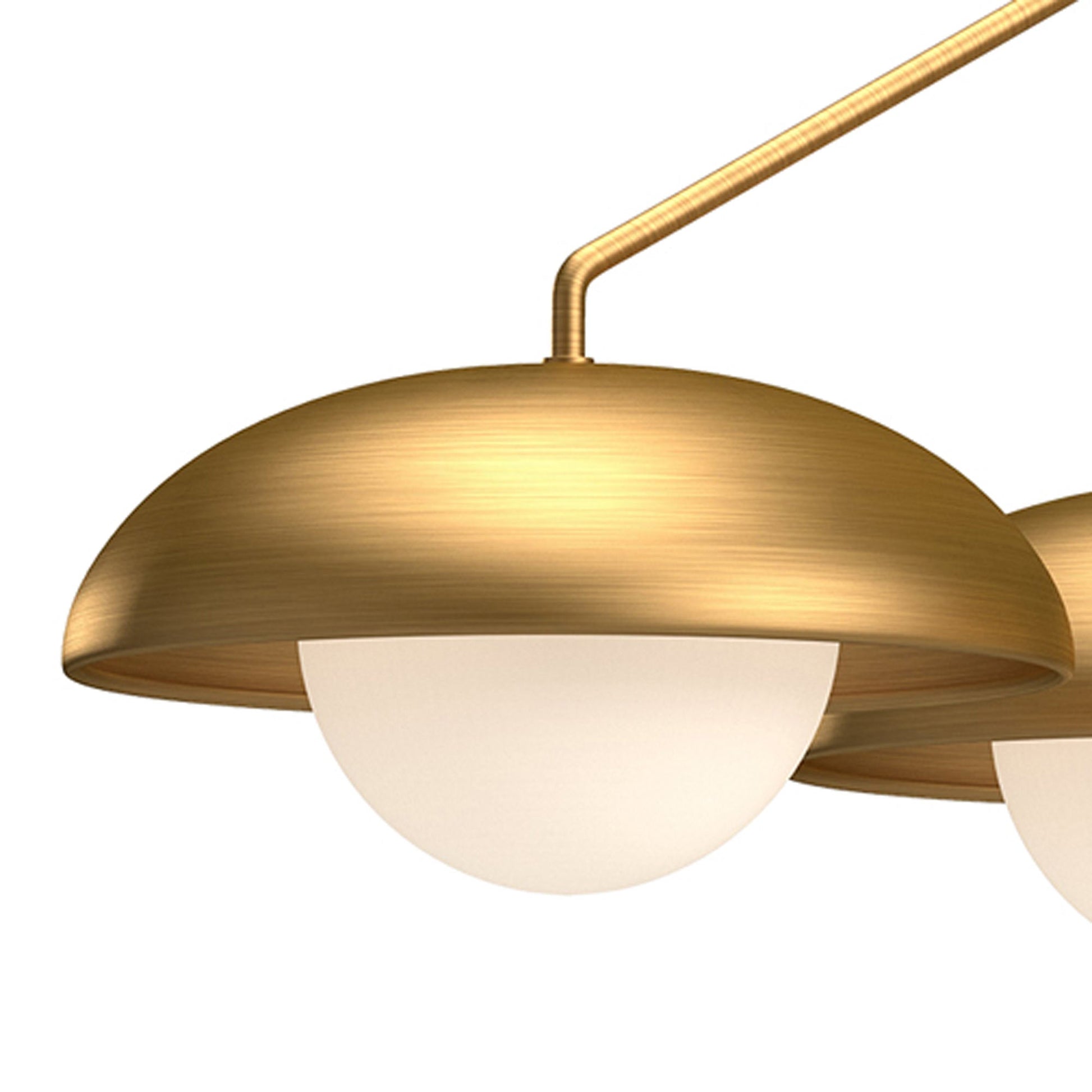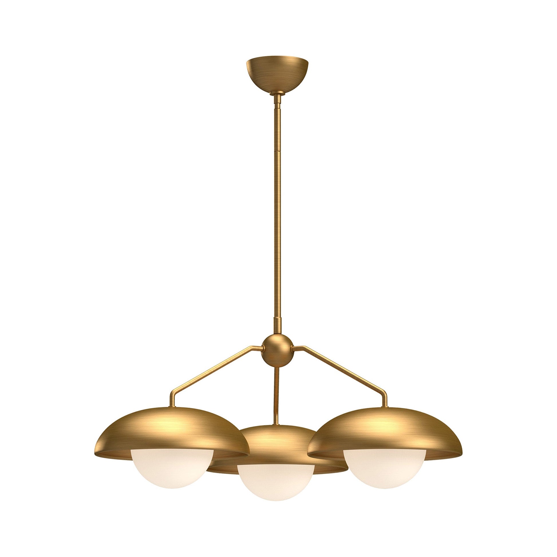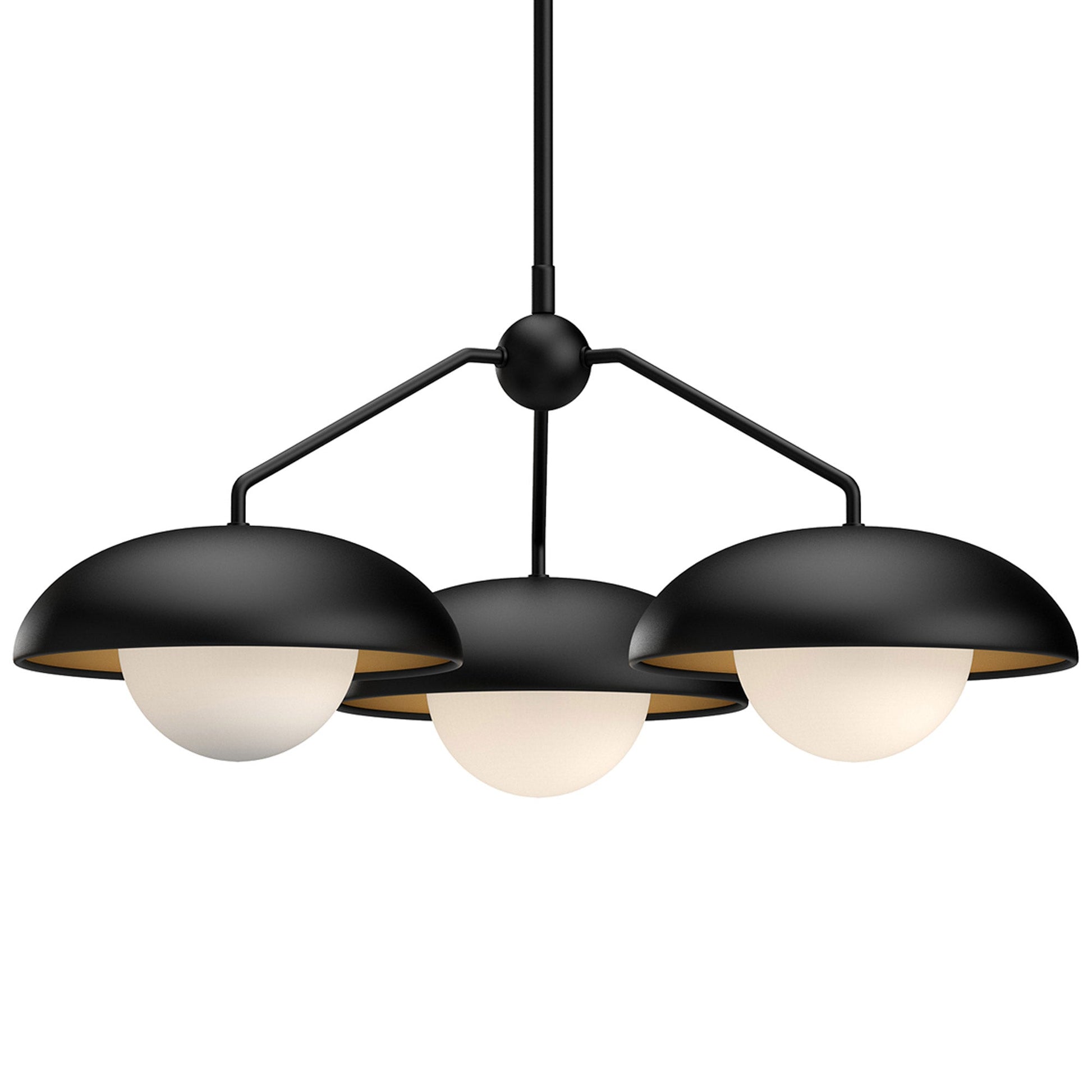 A festival of industrial-style lights creates delightful artistry as three grand metal half-shades float seamlessly, adding a stylish look to the Rubio Chandelier from Alora Mood. Symmetry and style reflect design elegance that can only come from romantic metal crowning opal matte glass globes sending radiant illumination over a dining ensemble, entertaining space, or kitchen island.