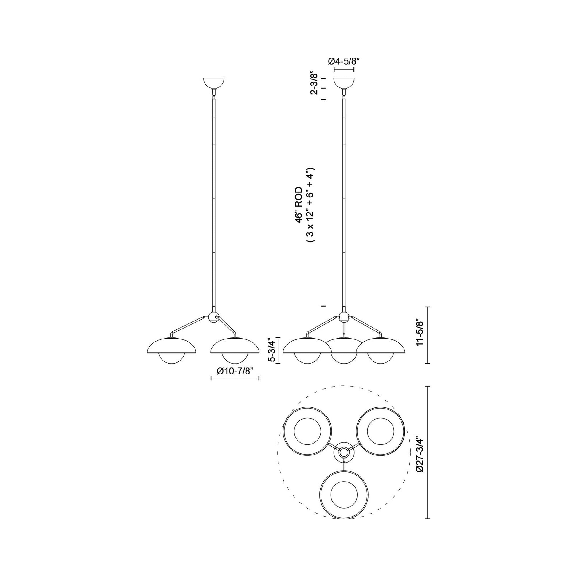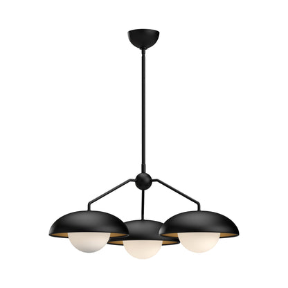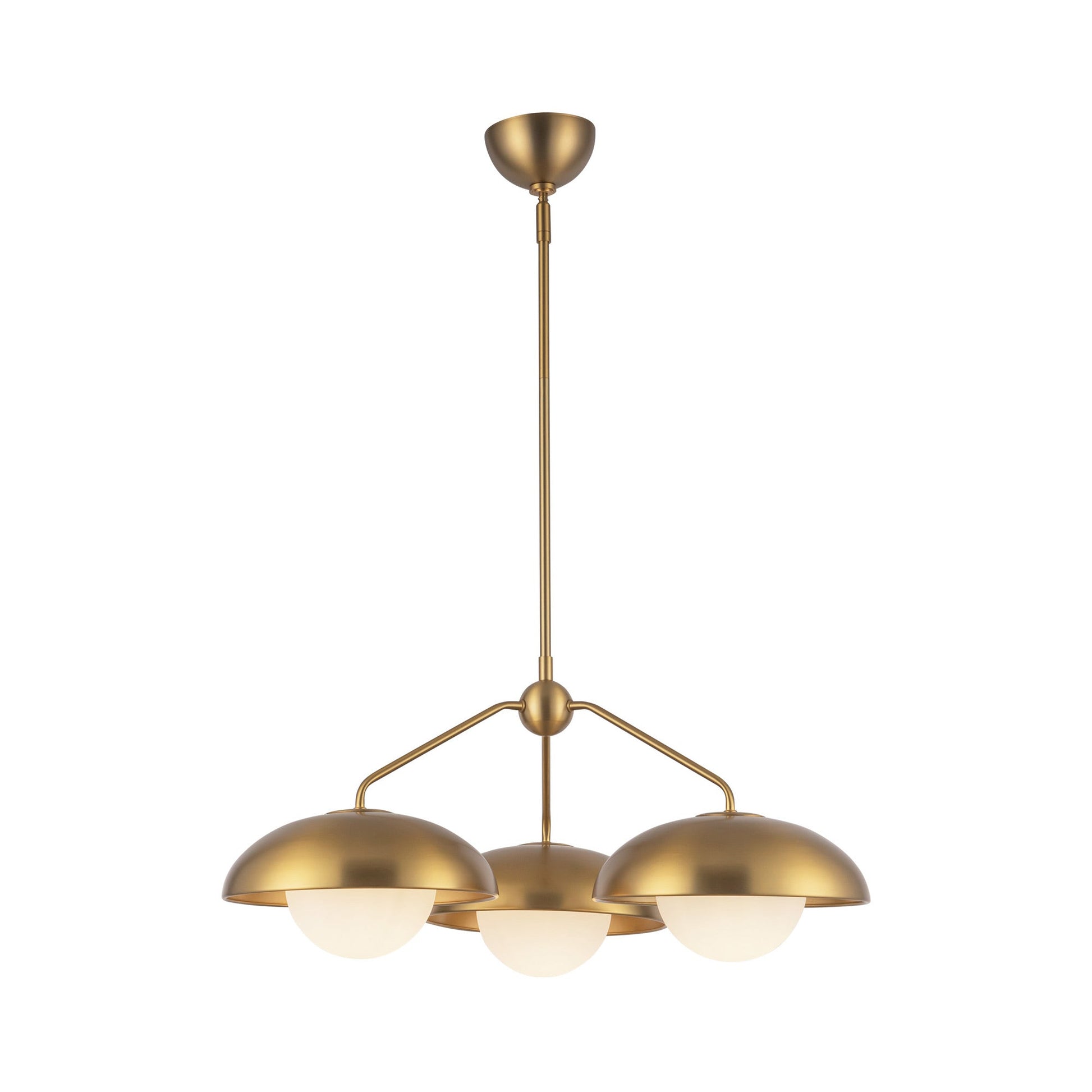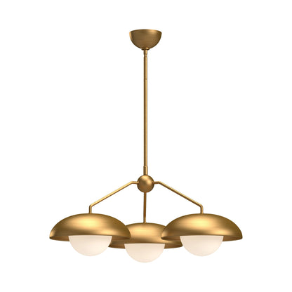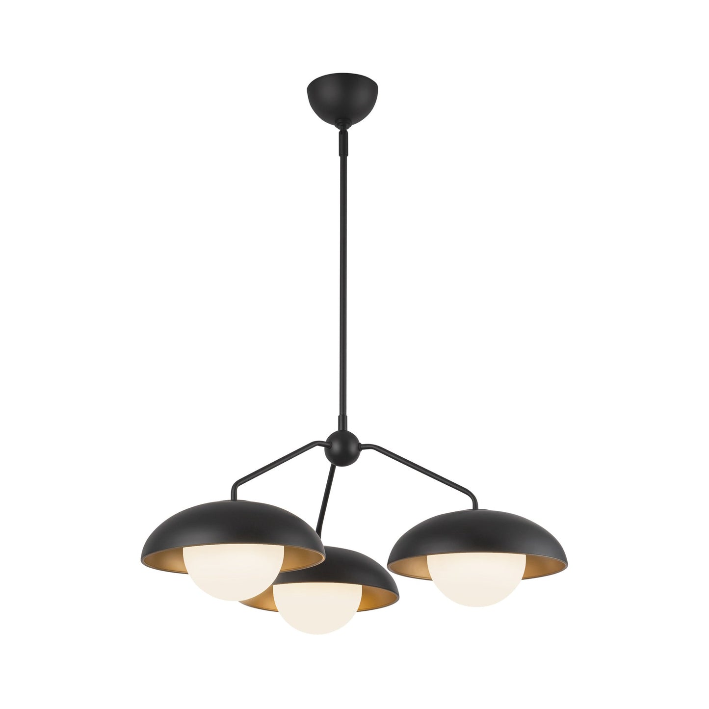 A festival of industrial-style lights creates delightful artistry as three grand metal half-shades float seamlessly, adding a stylish look to the Rubio Chandelier from Alora Mood. Symmetry and style reflect design elegance that can only come from romantic metal crowning opal matte glass globes sending radiant illumination over a dining ensemble, entertaining space, or kitchen island.