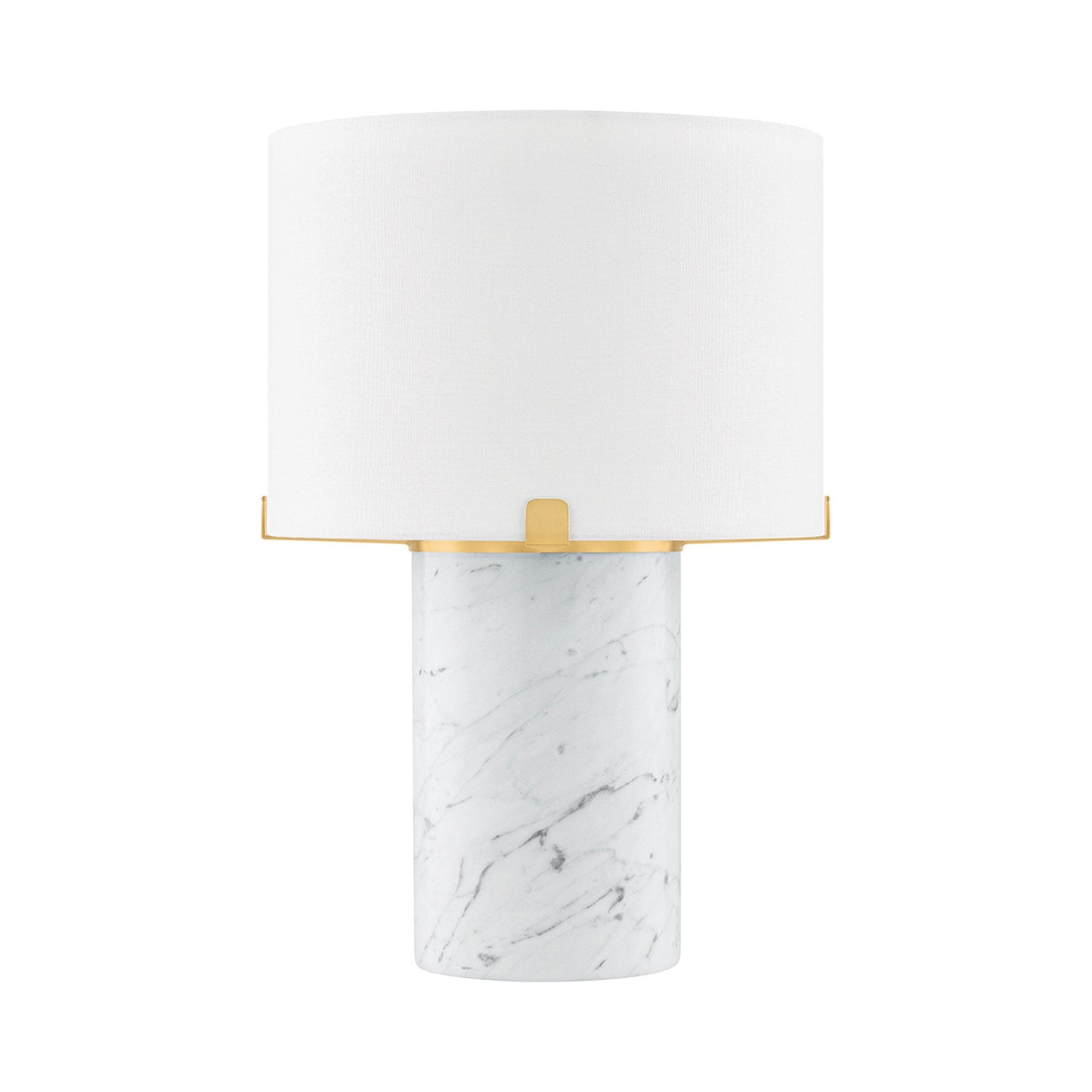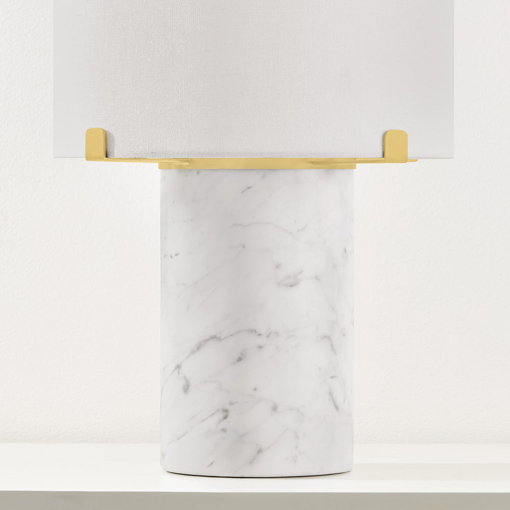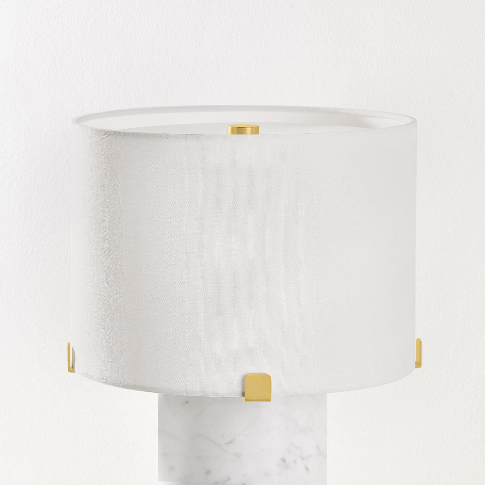 Stylish detail embellishes an already exotic and beautiful aesthetic in a lamp suited for exceptional spaces. The Rumi Table Lamp from Mitzi echoes bejeweled eloquence with a Carrara marble base and linen drum shade. Metal accents clip to its shade.