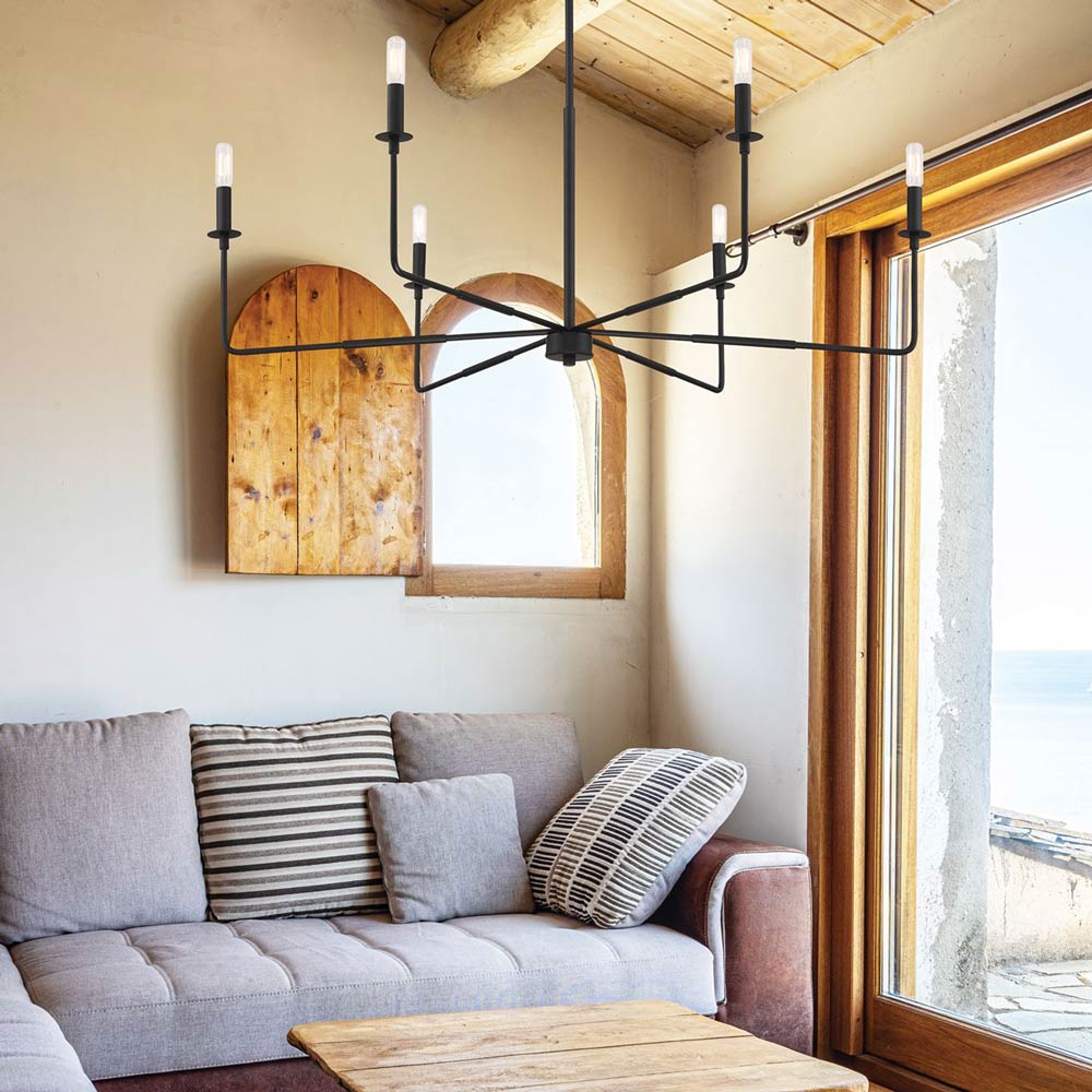 Sleek minimalist style proves less is more as the Salerno Chandelier from Savoy House embodies the best of simplicity to create dramatic impact. With a slender metal frame design and charming light caps, this fixture maintains focus on furnishings and décor accents, adding a brief taste of industrial-inspired character.