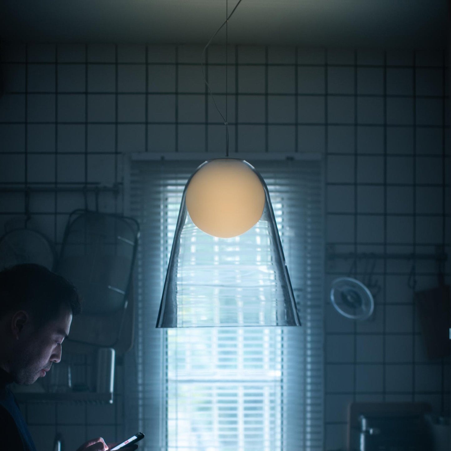 A surprising design inspired from space, the Satellight Pendant Light from Foscarini suspends like a moon in the night. Add this pendant light above a bold black dining table for an artful experience.