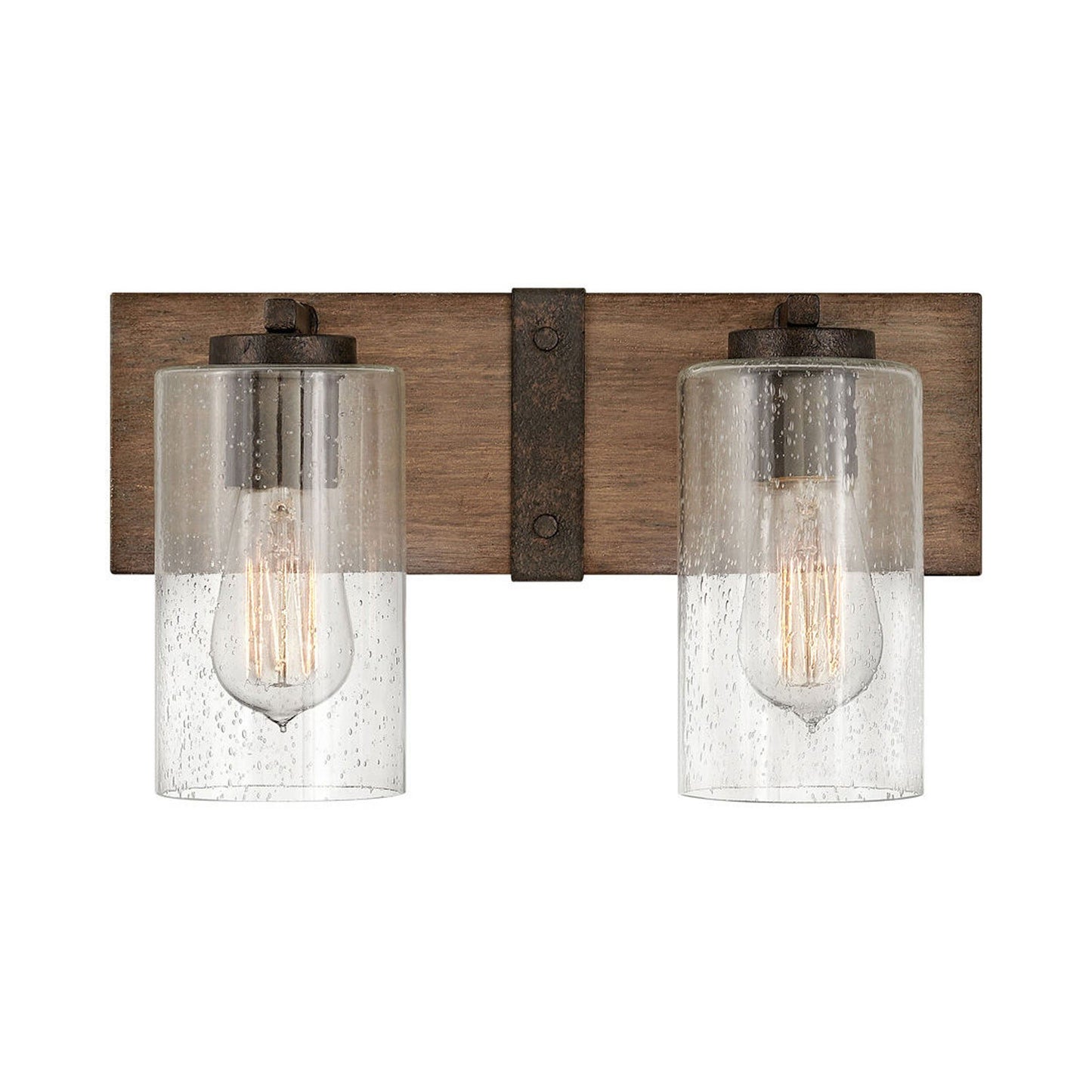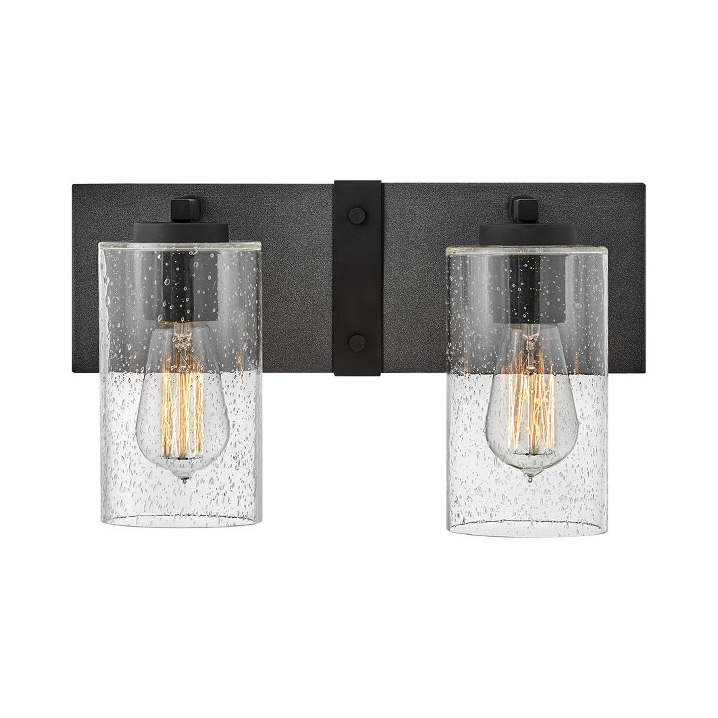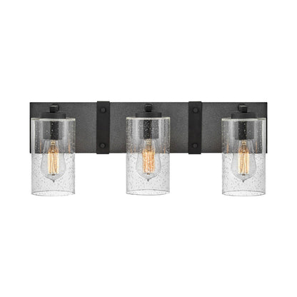 Seedy glass cylinders pair with black accents to bring richness and depth to the Sawyer Bath Vanity Light from Hinkley. Its aged zinc finish reinforces a modern farmhouse ambiance, offering depth and contrast to an eye-catching fixture.