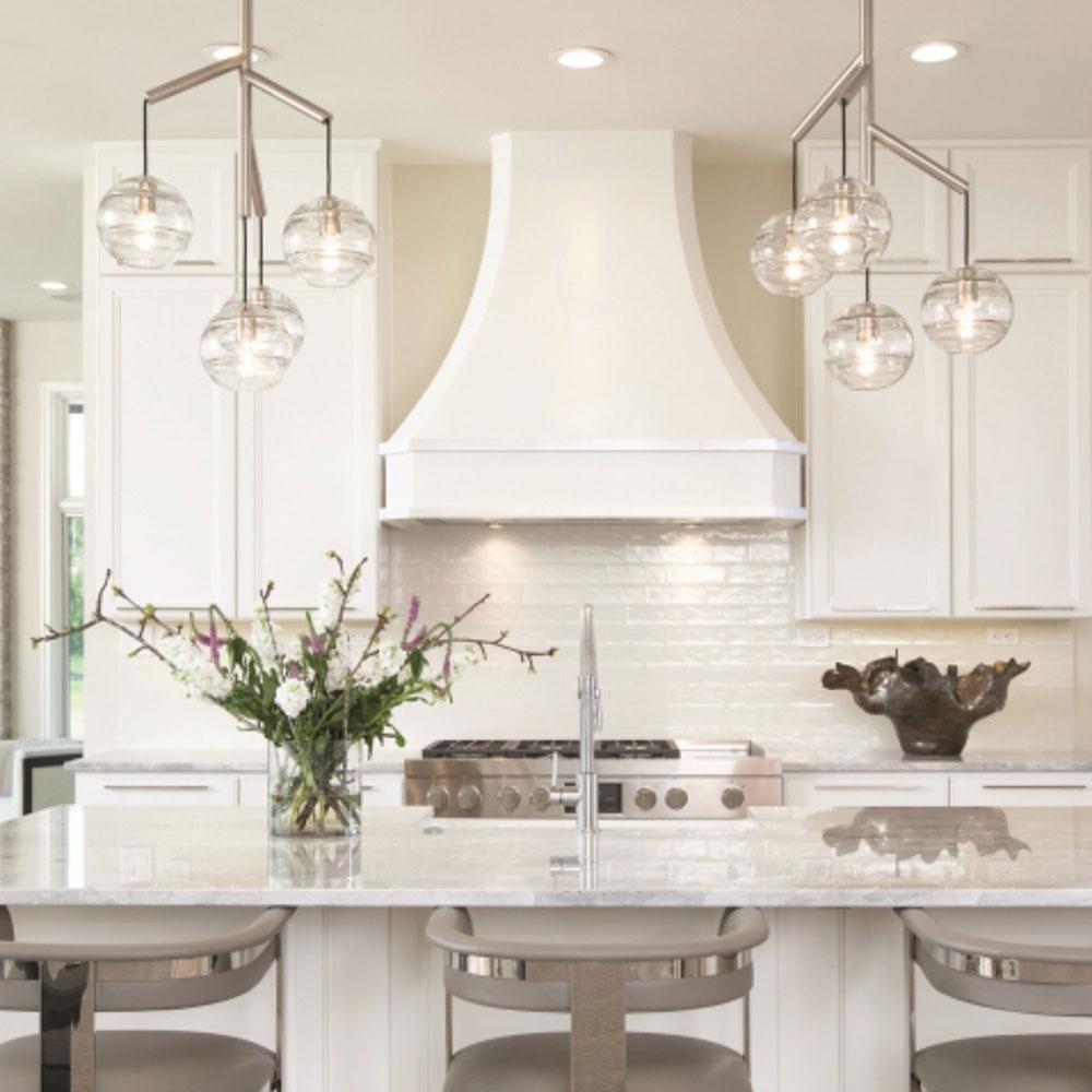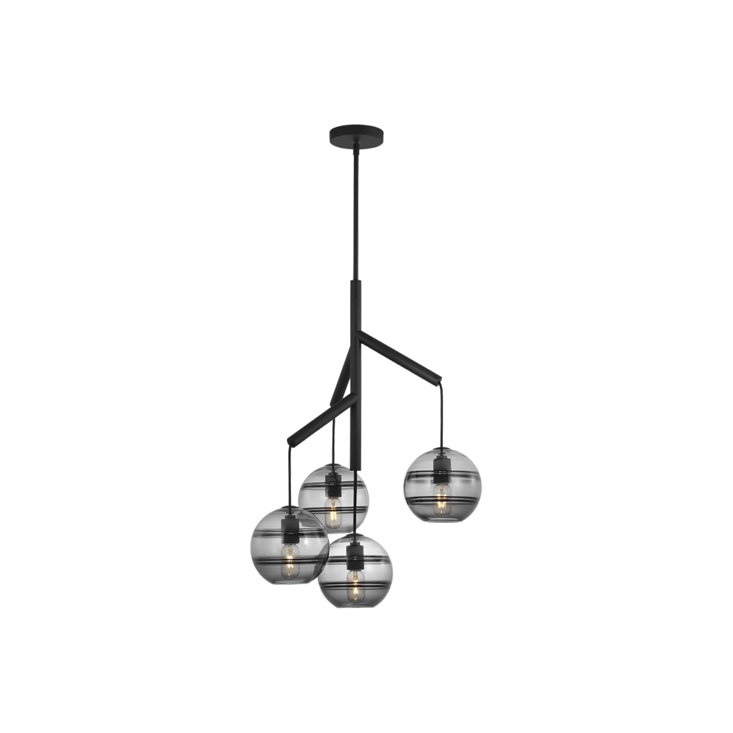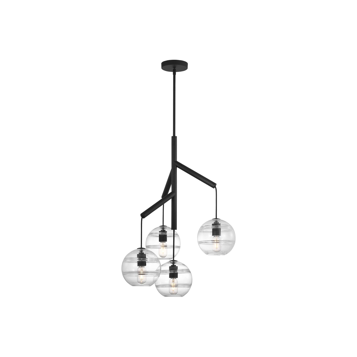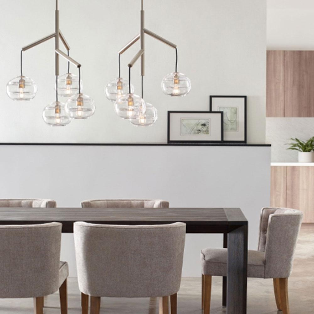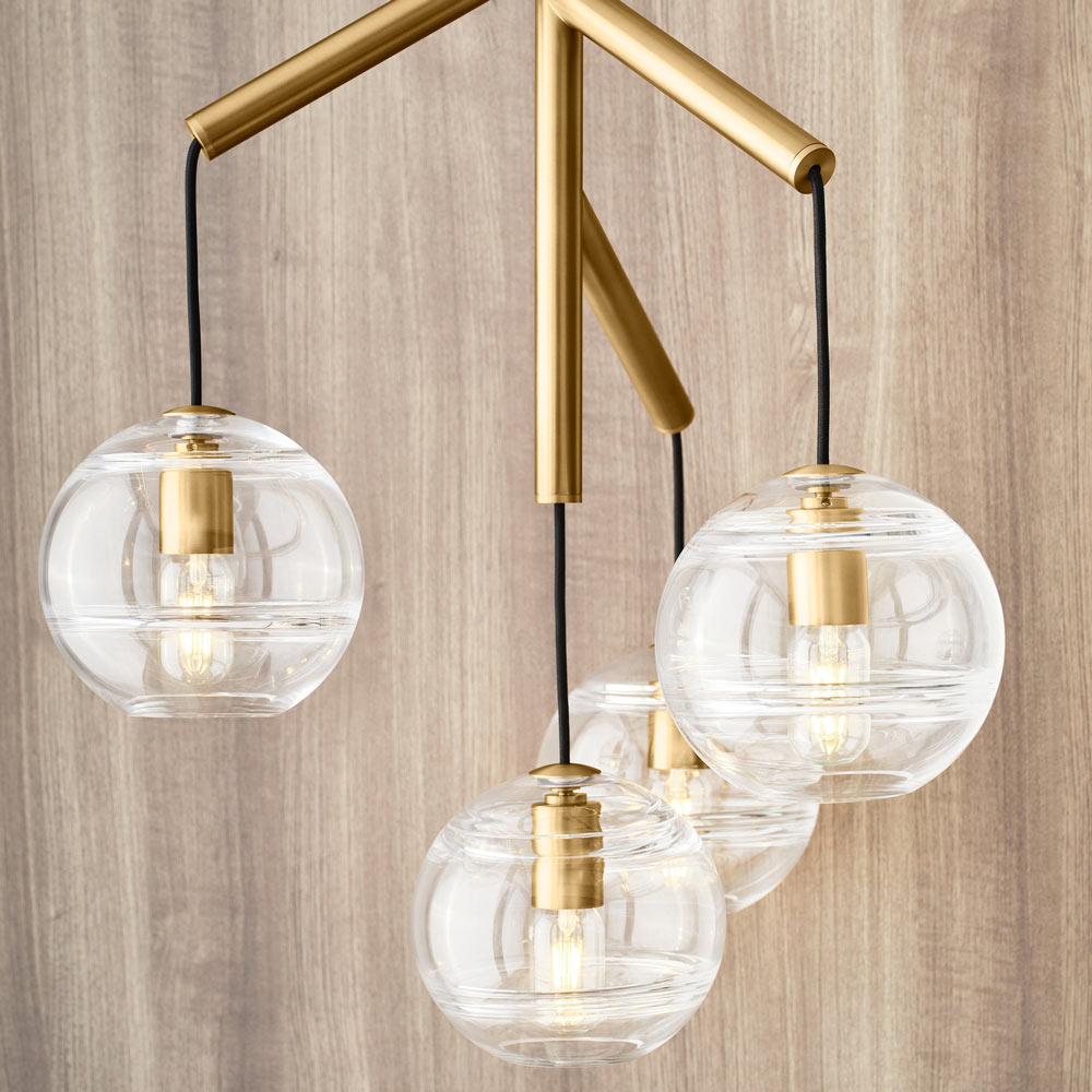 The Sedona Multi Light Pendant Light from Visual Comfort Modern perhaps is best described as a deconstructed modern chandelier, where four glass orbs are each suspended from the sleek branchlike central hub via contrasting textured cloth covered cords to make a distinctly alluring visual statement. While each transparent clear or transparent smoke glass orb is perfectly spherical and smooth on the exterior surface, the interior surface features gradually thickening bands of glass which are artfully crafted by talented artisans to add alluring visual interest and dimension to your space. Whether you select the single, double or triple chandelier, you are sure to find a option perfect for your kitchen island lighting, dining room lighting or living room lighting application. Its two fully dimmable vintage tubular style LED lamping options are not only energy efficient, but also allow you to customize these pendant lights to your desired ambiance.