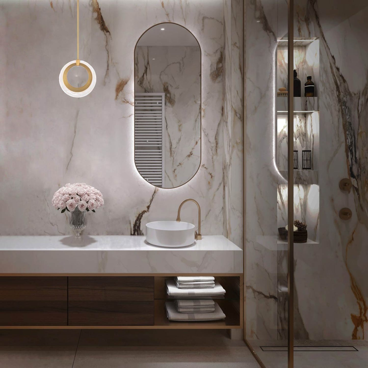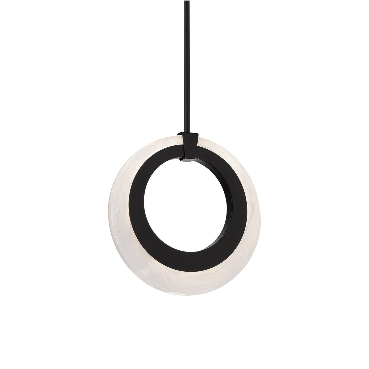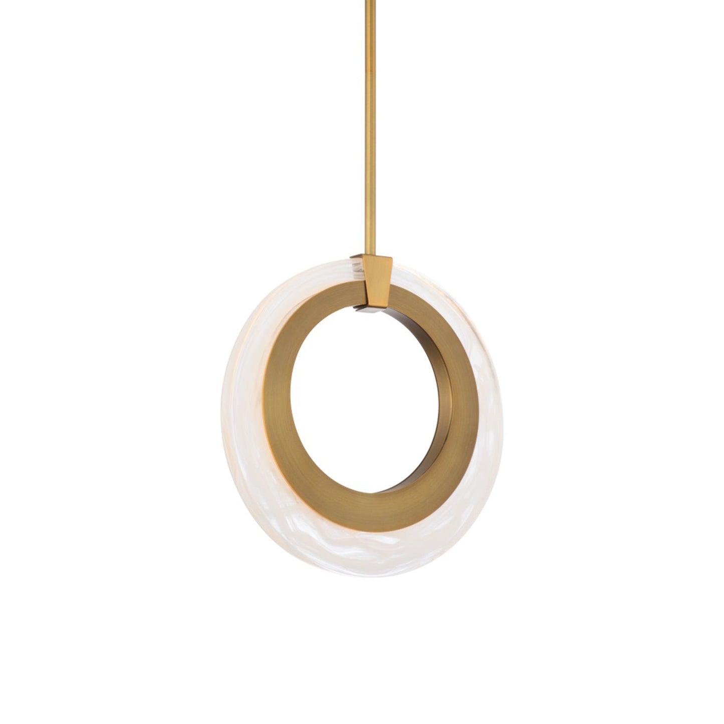 Artisanal wispy glass wraps round an aged brass finished ring like a luxurious earring for the home. A curved concept and invitation to embrace luxurious living with unparalleled style. Modern aesthetic with an artist touch for this mini pendant.