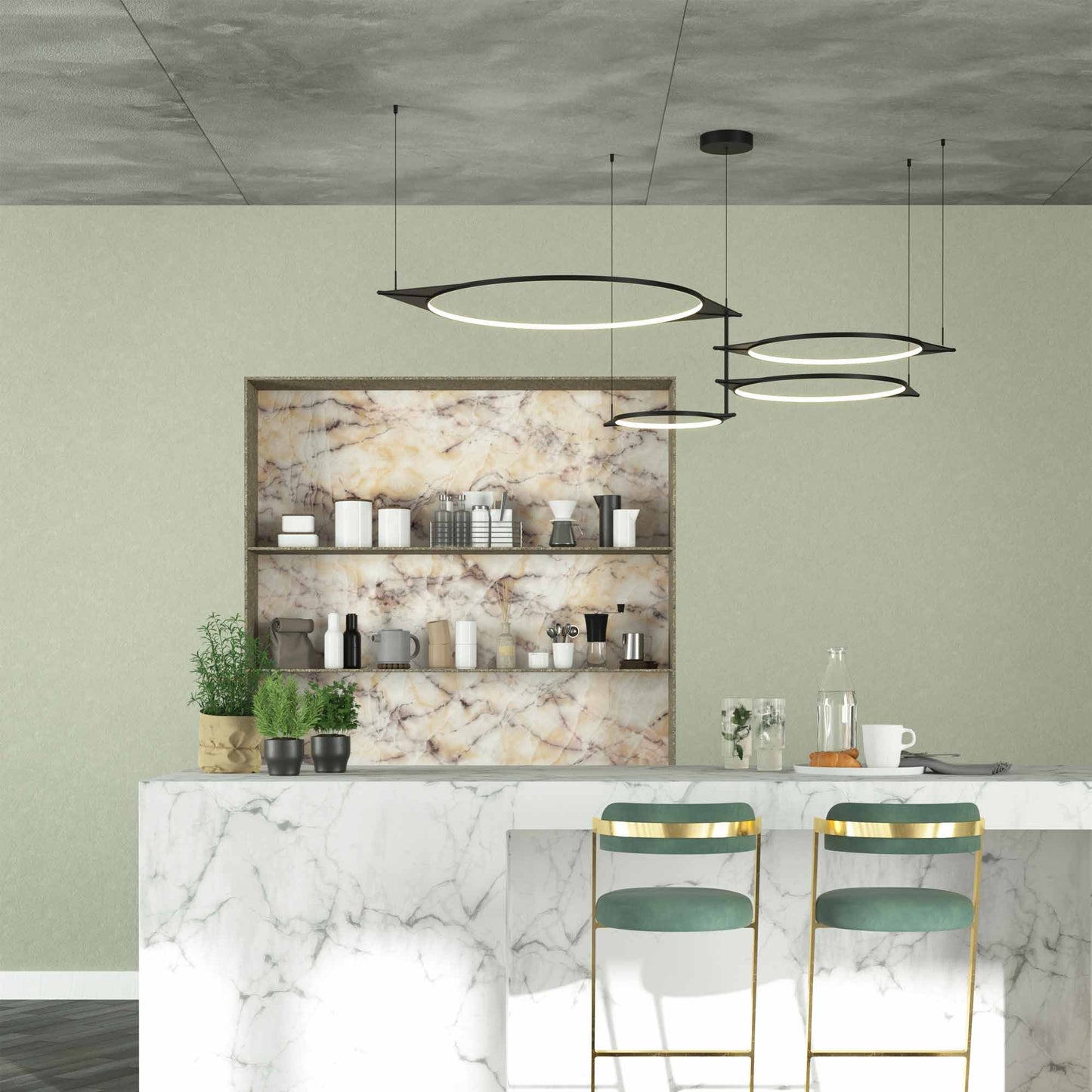 The Serif Collection features clean, angular geometrics colliding in harmony. Minimal yet impactful, the rings of light seem to float organically in air. Each piece of the Serif Collection is adjustable to fit your style, from minimal and clean uniform rings, to free-form. This versatility makes it the perfect mixture of both two- and three-dimensional art depending on the ring formations you create.