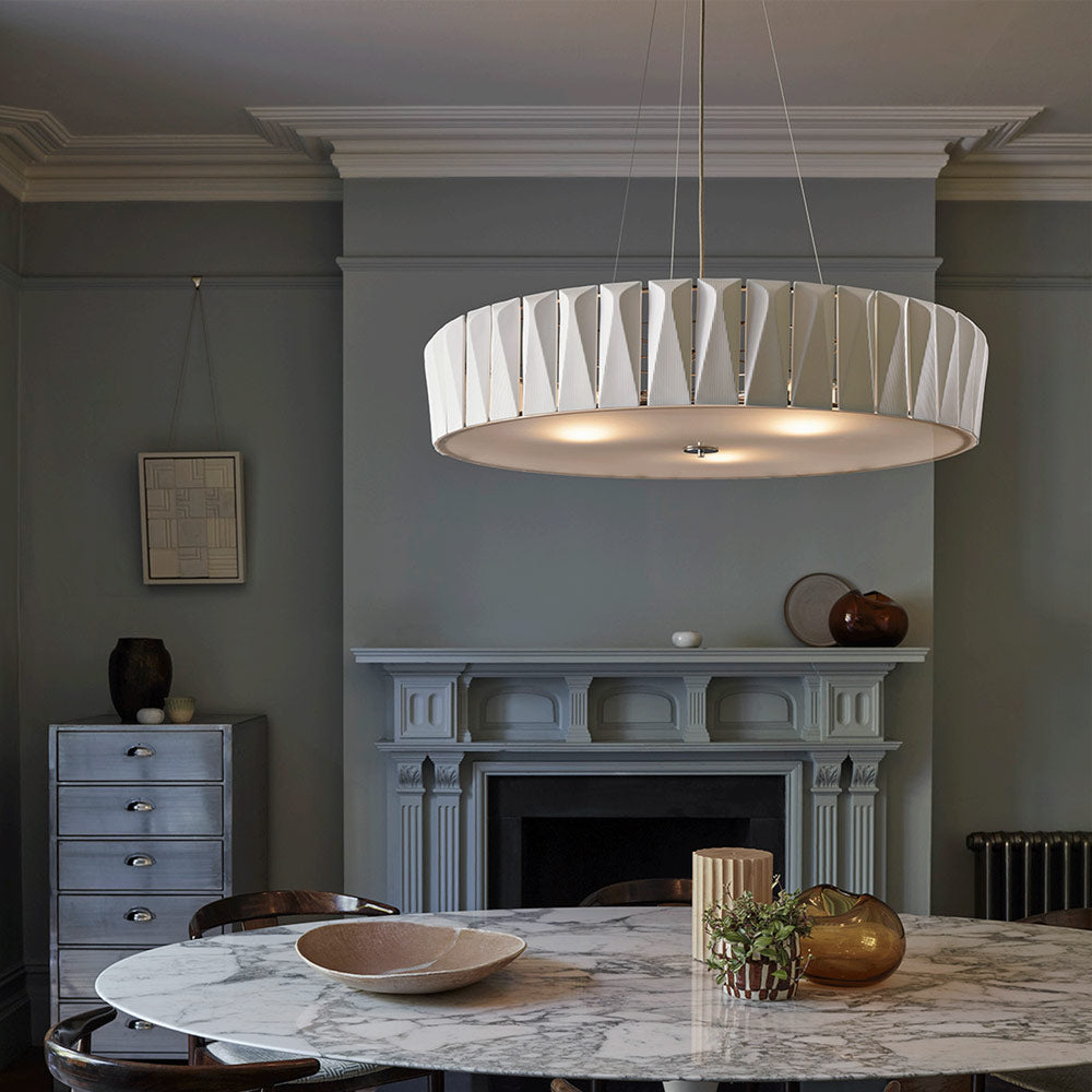 Organic flair follows the Shard Chandelier from Original BTC, an enticing example of less-is-more artistry. Natural matte white bone china tiles embellished with geometric textural elements align in perfect order around a ring frame, versatile and casual. A diffuser filters light as it flows downward to improve conditions in a dining room or living space.
