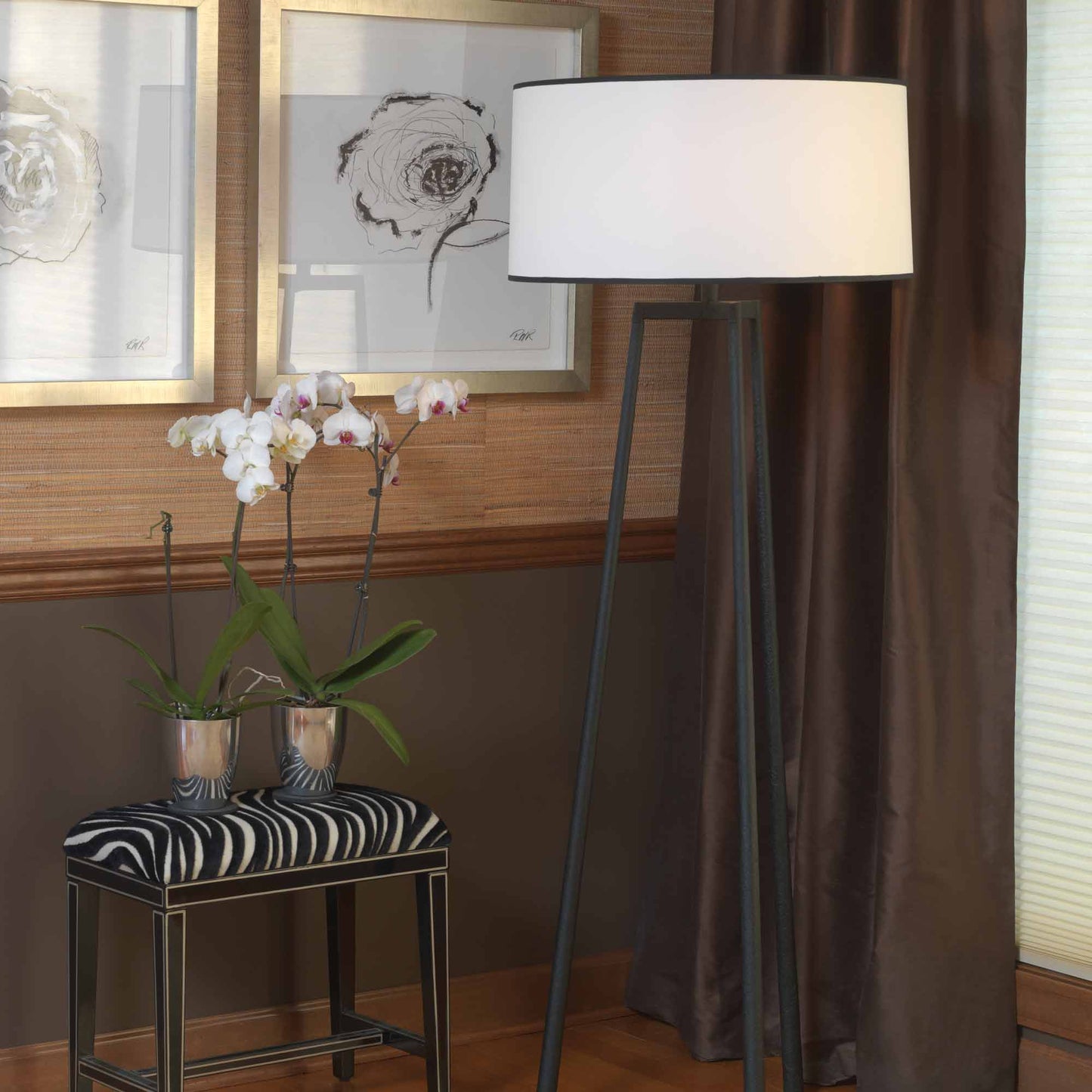 Casual retro influence shapes a crisp ambiance in the Shinto Floor Lamp from Robert Abbey, drawing on definition and geometry in a mix of metal and fabric with contrasting trim.