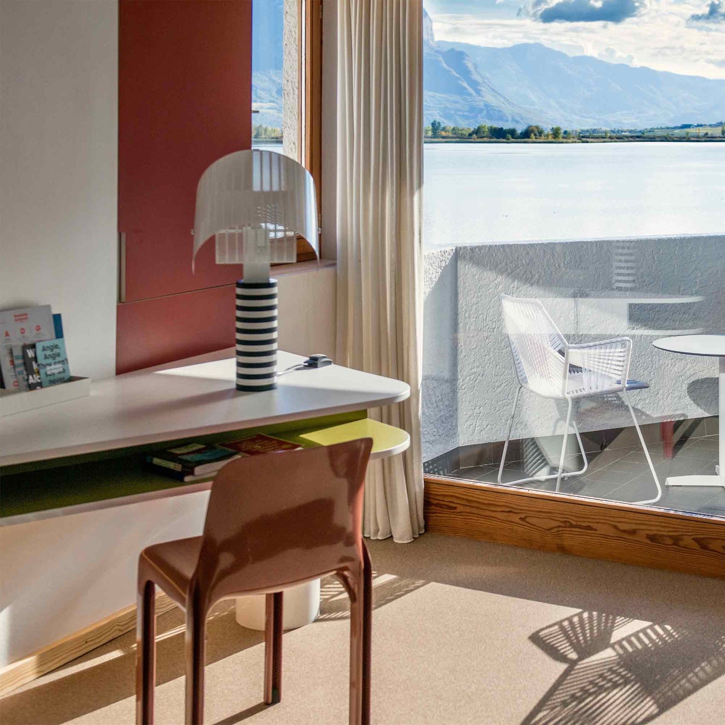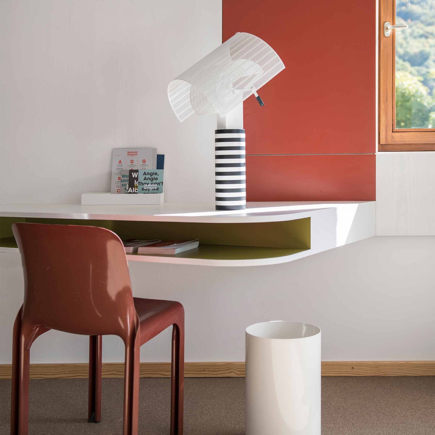 Perforated steel and black & white stripping define the iconic modern artistry of the Shogun Table Lamp from Artemide.
