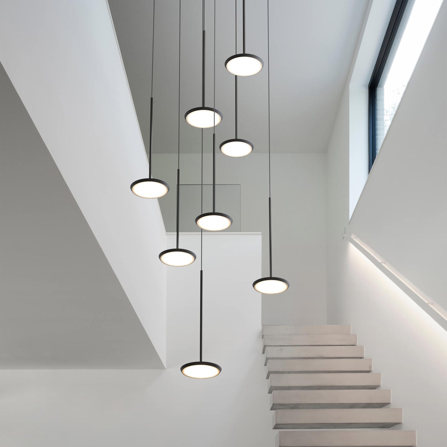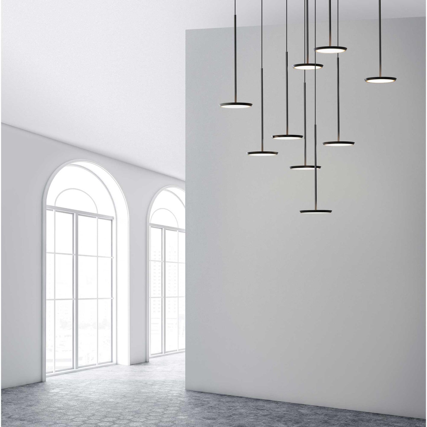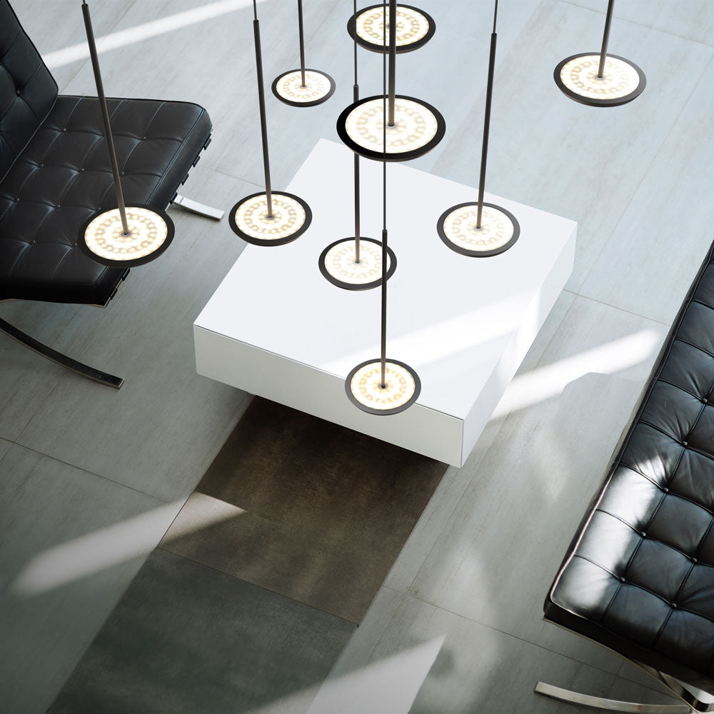 A stunning display of contemporary attitude accompanies the Sky LED Multi Light Pendant Light from Pablo. Follow the visuals of a sleek modern arrangement of disk LED modules and shades in staggered lengths, enjoying the ability to customize to suit your taste.