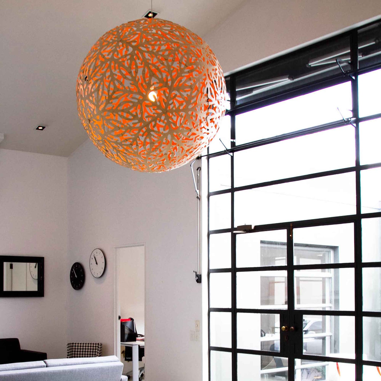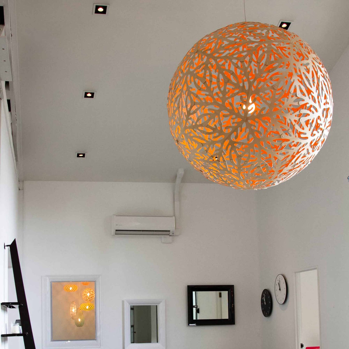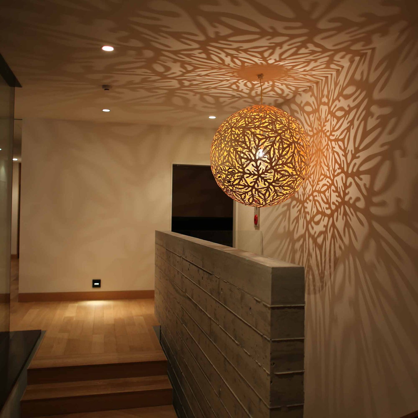 Highly decorative, the Sola Pendant Light from David Trubridge is constructed of intricate, intertwined fronds that spill light to create engaging, artistic shadow patterns across a foyer or dining room. Its orb silhouette introduces a sense of balance and symmetry to its complex, geometric structure.