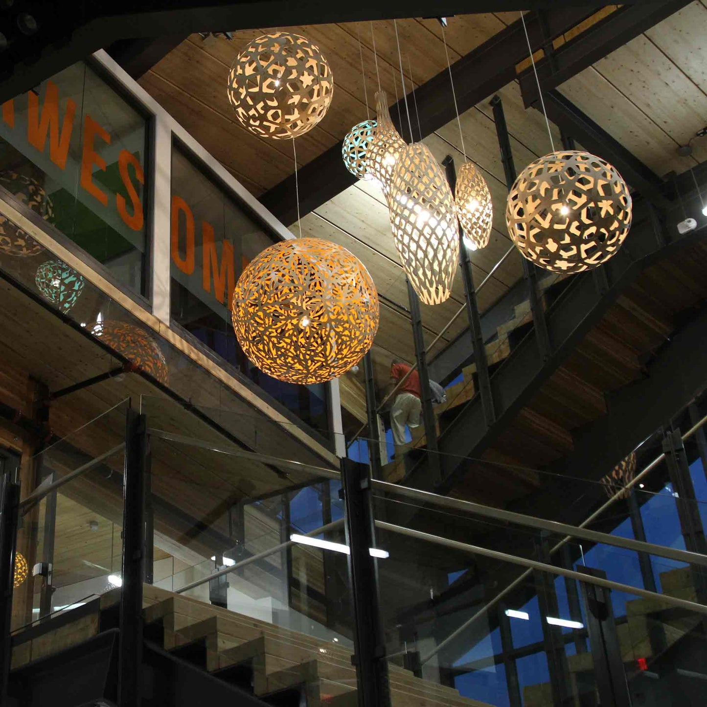 | David Trubridge uses sustainably sourced plywood, birch and bamboo along with non-toxic oils to craft open, airy and geometric designs with an organic vibe. Forms found in nature and in the native Maori culture of New Zealand, where the company has its headquarters, inspire the creations. Some pendants, for example, resemble clouds while others look like coral reefs. The results are more than functional lighting fixtures – they set nighttime ambience and serve as daytime showpieces. The fixtures then are shipped in eco-friendly packaging. David Trubridge’s unique style helped spur the “raw sophistication” trend that since has taken root internationally. The company also donates to environmental causes. Find the perfect masterpiece for your intimate or grand space, as a single piece or a large installation, at David Trubridge. |