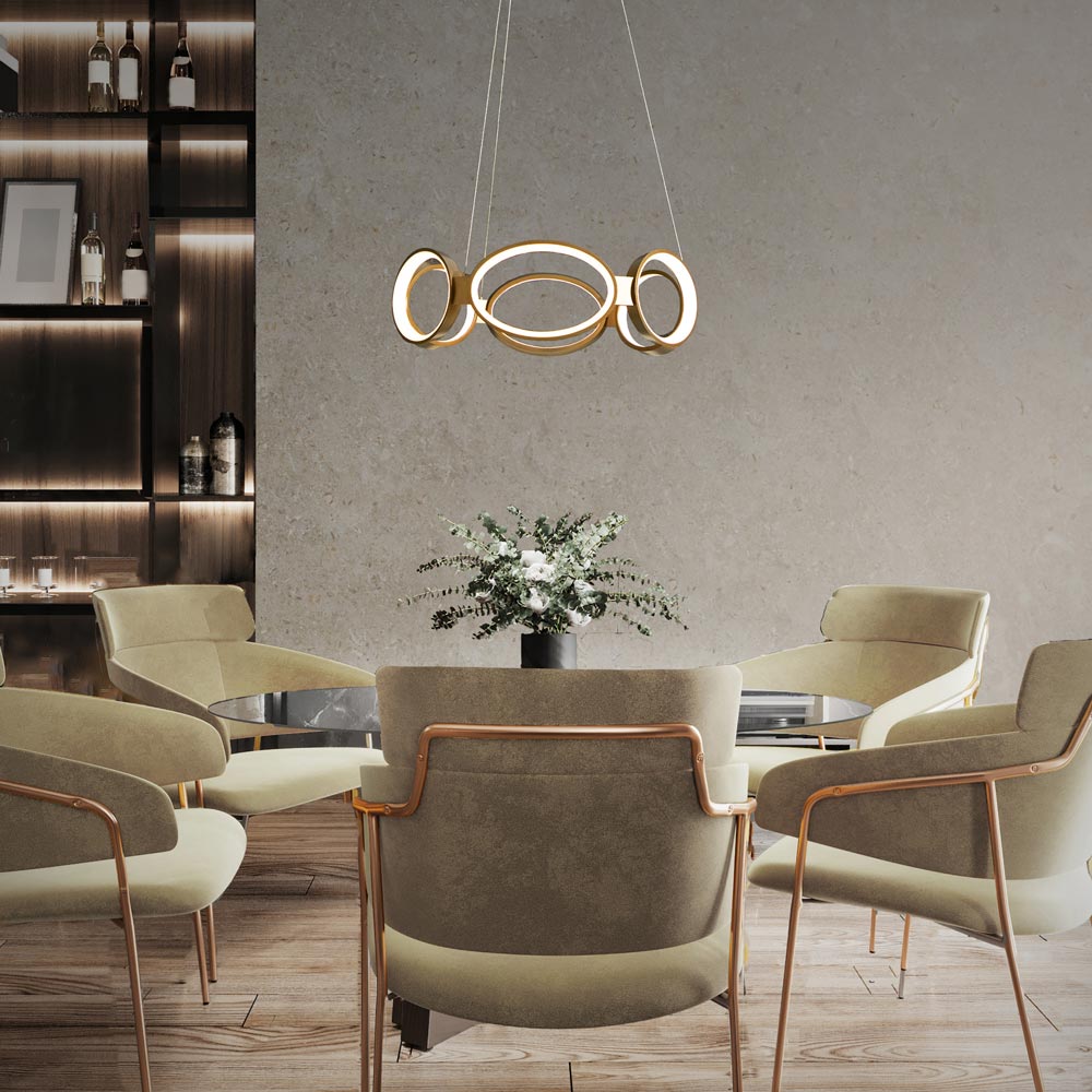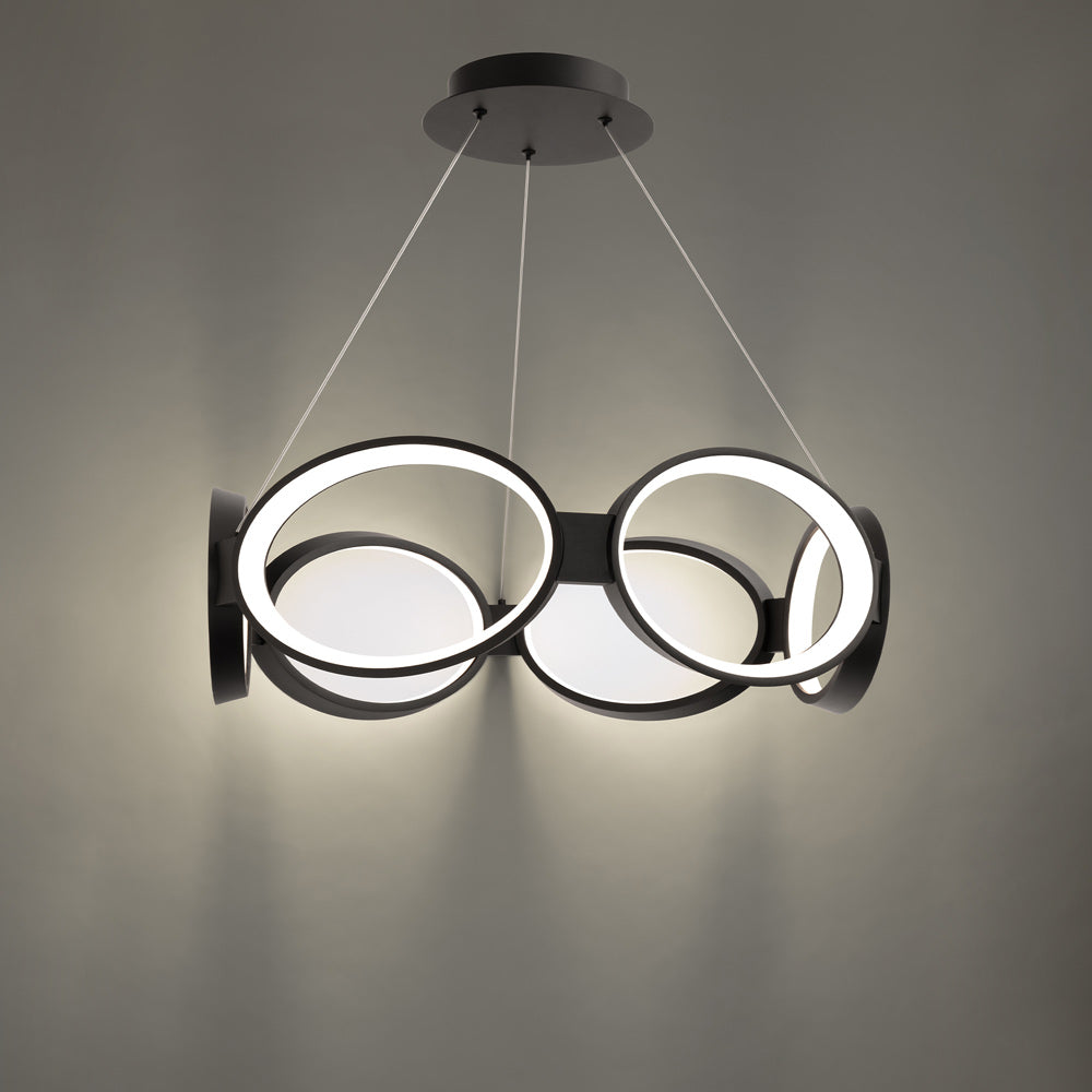 The laid-back industrial charm of studio influence creates artisan elegance in the Solitaire LED Pendant Light from dweLED. Whimsical in style, this energy-efficient fixture is fashioned of spirited connected ovals made of lightweight aluminum, each lined with silicone diffuser strips that send lighting in many directions. A minimalist design motif is energized with charm as this pendant attracts attention from floor to ceiling.