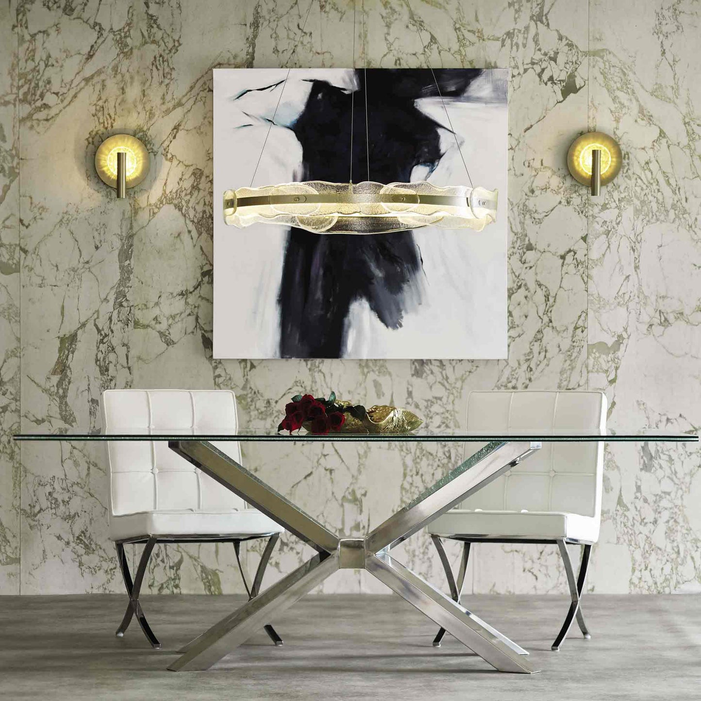 A textured, artisanal glass disc layered over a metal disc creates a stunning effect for the Solstice Wall Light from Hubbardton Forge.