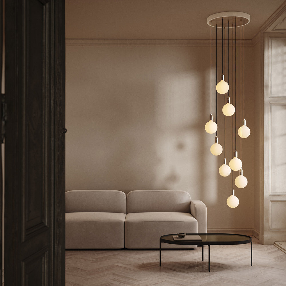 Clustered bulbs suspend from graduated lengths to deliver a striking light show as the Sphere IV Multi Light Pendant Light from Tala becomes an artisan display as well as a source of critical illumination. Proprietary bulbs housed in a prominent round ceiling canopy offer a compelling visual experience from top to bottom as they infuse ambient lighting in a living room, entryway, or dining space.
