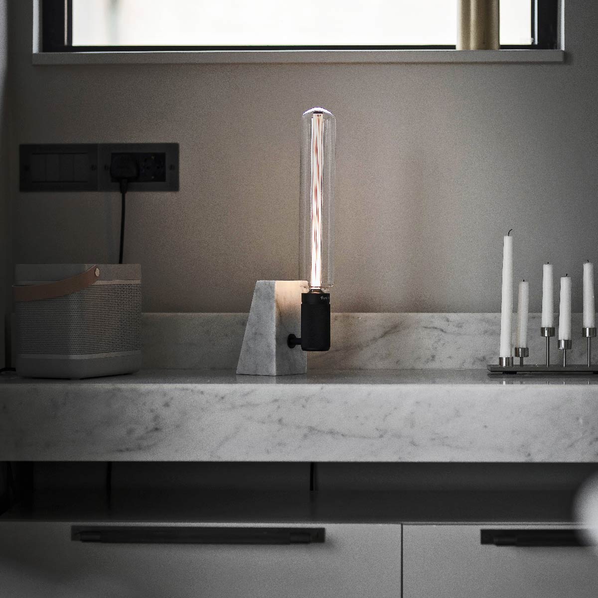 The Stoned Table Lamp from Buster + Punch works gritty geometric style into an intriguing concoction. Marble and an exposed open cylindrical bulb act in concert to deliver an impressive statement-making look and accent lighting ideal for any setting.