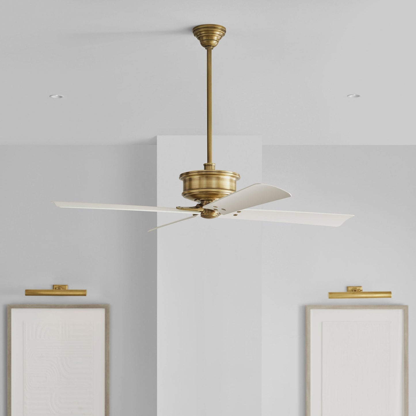 Patios and gazebos realize the benefit of comfort and style as the Subway Ceiling Fan from Visual Comfort Fan delivers a well-rounded package. Chic vintage vibes emanate from a sculpted metal canopy and housing unit, with four slightly tipped blades activate by remote control to year-round settings of normal and reverse.