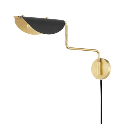 The Suffield Portable Wall Light from Hudson Valley Lighting delivers a chic artisan look combined with the convenience of portability. Choose a spot in need of ambient lighting and plug in this decadent light with a design form that mixes industrial with Art Deco. A curved metal shade sending illumination in a downward direction, as fluidity romances with a curved arm and round wall plate, creating an asymmetrical silhouette.