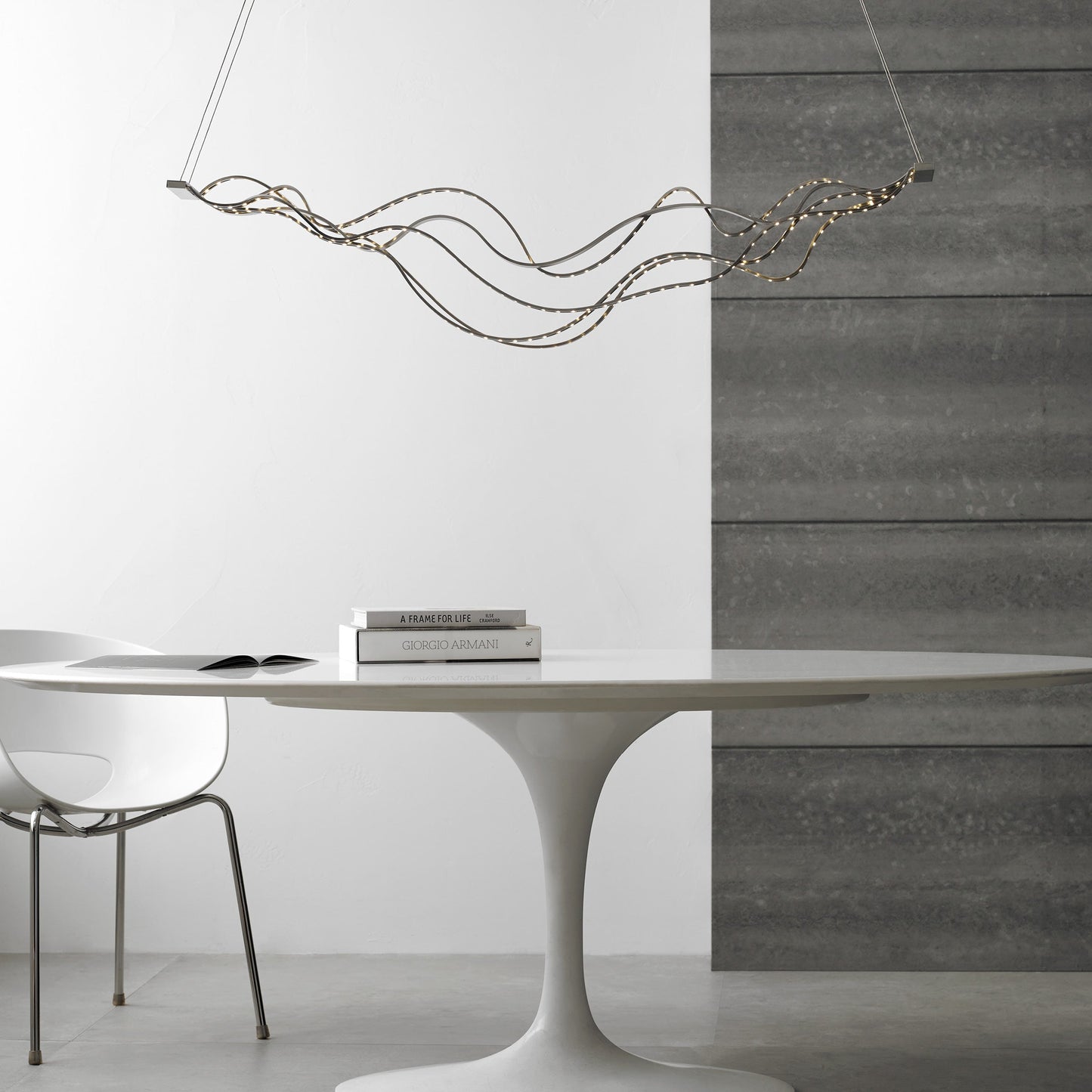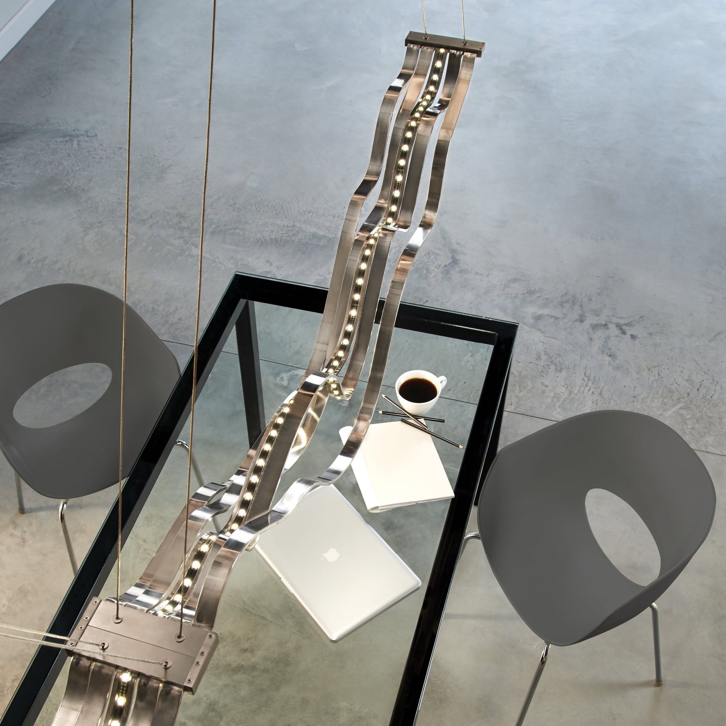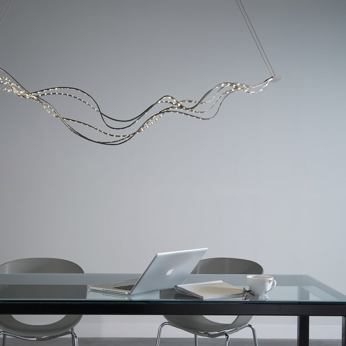 The Surge LED Linear Suspension Light from Visual Comfort Modern appears to float effortlessly with its smooth wavy lines. The graceful force of ocean waves is captured when gently undulating bands of downward and upward firing LED strips join to form a striking fixture capable of creating layers of illumination. Fixtures can be linked together end-to-end to create longer, continuous runs using the optional Mechanical Connector. The Surge fixture spans 54” in length making it ideal for conference room lighting, foyer lighting and a host of commercial and residential lighting applications. Your choice of fully dimmable LED lamping ships with the Surge saving you both time and money. Downward and upward facing LED strips provides downlight and uplight to create layers of illumination. To empower lighting designers to create unique applications, fixtures can be linked together end-to-end to create longer, continuous runs using optional Mechanical Connector.