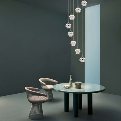 Metal bands bisect the glowing crystal bubbles descending from the Swank LED Multi-Light Pendant Light from ET2 Lighting.