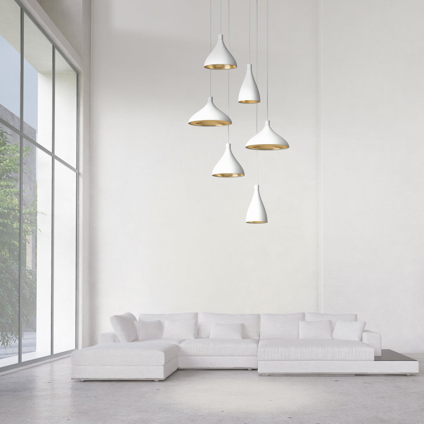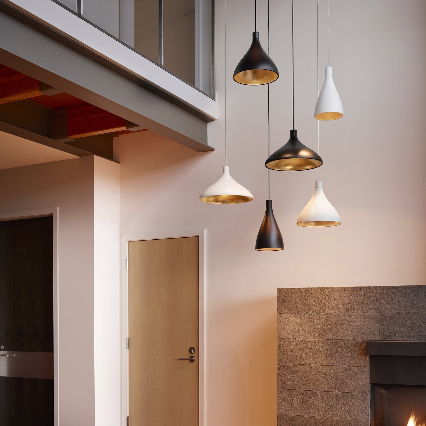 Elegant fluid lines enhance the contoured shape of the Swell LED Multi-Light Pendant Light from Pablo and its gorgeous finish combinations. A touch of industrial character adds energy to a light offering a lightweight aluminum shade invoking a chocolate kiss silhouette. Place a solo light in a visible spot, or string together Swell lights in a group to assemble a visibly captivating look.
