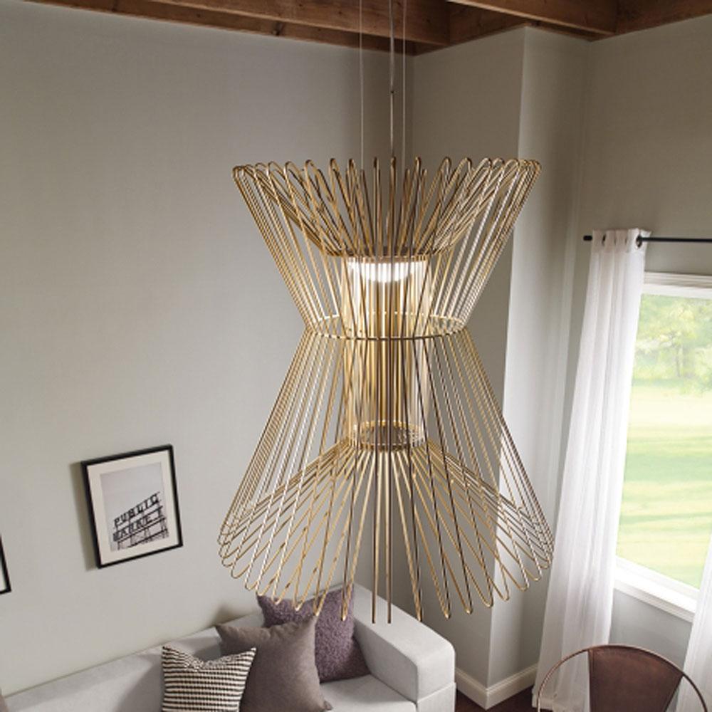 The modern Syrma Grande LED Pendant Light from Visual Comfort Modern features dozens of machined metal rods which are painstakingly fastened at perfectly spaced intervals to form an incredible multidimensional shade. At its core, this pendant, available in a scalable 19" and an oversized 38" heights, emanates light from its smoothly diffused LED source to illuminate surfaces below such as kitchen island lighting, dining room lighting, home office lighting, entry lighting or even commercial conference room lighting. Inspired by mid-century modern design, the Syrma is offered in your choice of Matte Black or Satin Gold finishes and includes a coordinating cloth-covered cord and ceiling canopy.
