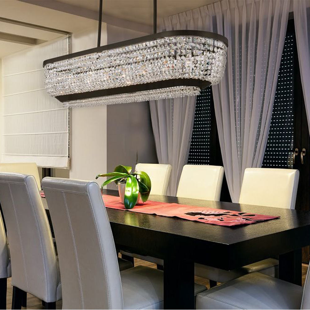 Long and elegant, the Terzo Linear Pendant Light from Allegri is a superb choice for a kitchen island or dining table. Matte black framework creates structure and dimension for glittering rows of crystal that create a curtained effect and deliver diffused illumination. Graceful curves define the design, offering a modern sensibility to a traditional concept in home lighting.