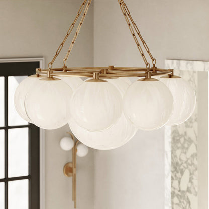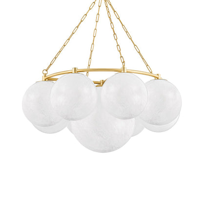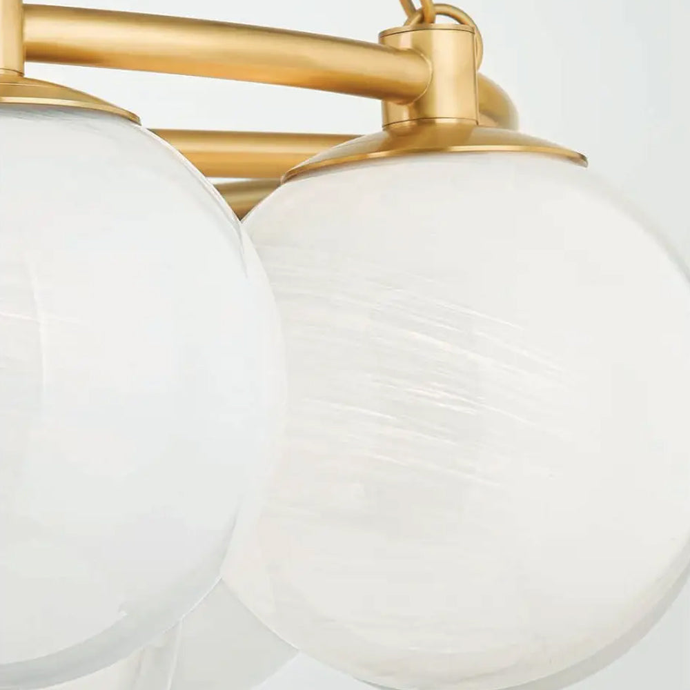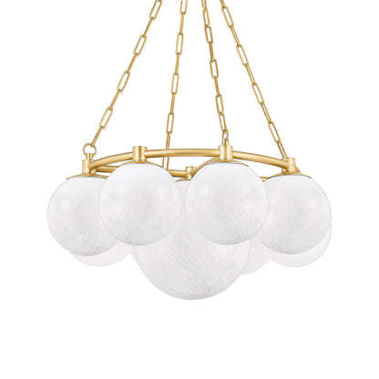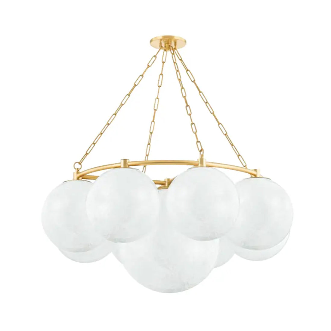 Stylish and festive vibes are limitless when the Thornwood Chandelier from Hudson Valley Lighting becomes a focal point in a modern living space. Add cheery attitude with a decadent fixture gathering cloud glass globes that appear to float in mid-air as a tempting metal ring frame and cable chain suspension infuses a hint of industrial creds. Make this fixture a prominent light source in a foyer, dining room, or living room.